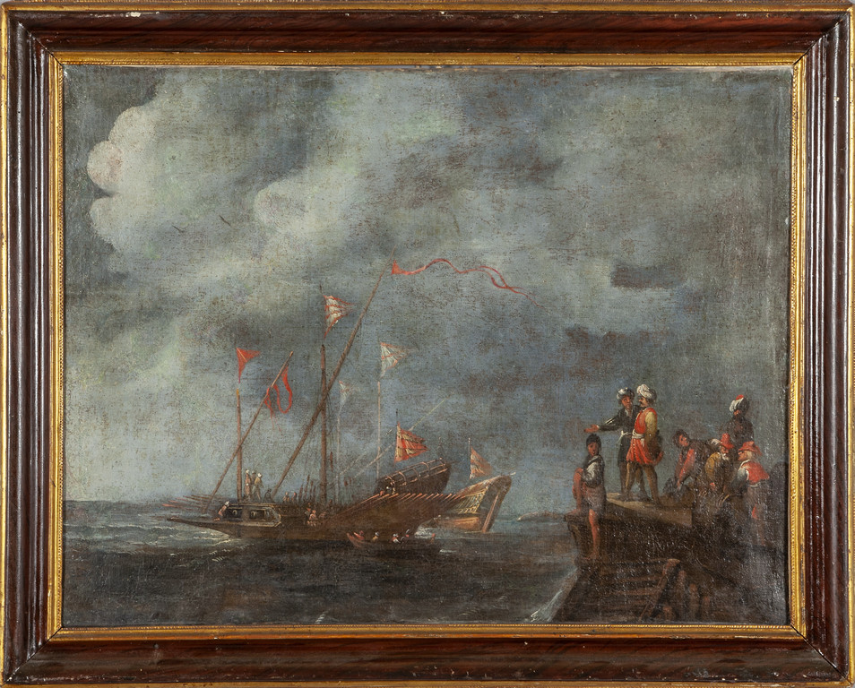 Scuola fiamminga sec.XVII 'Galee turche' olio sec.XVII