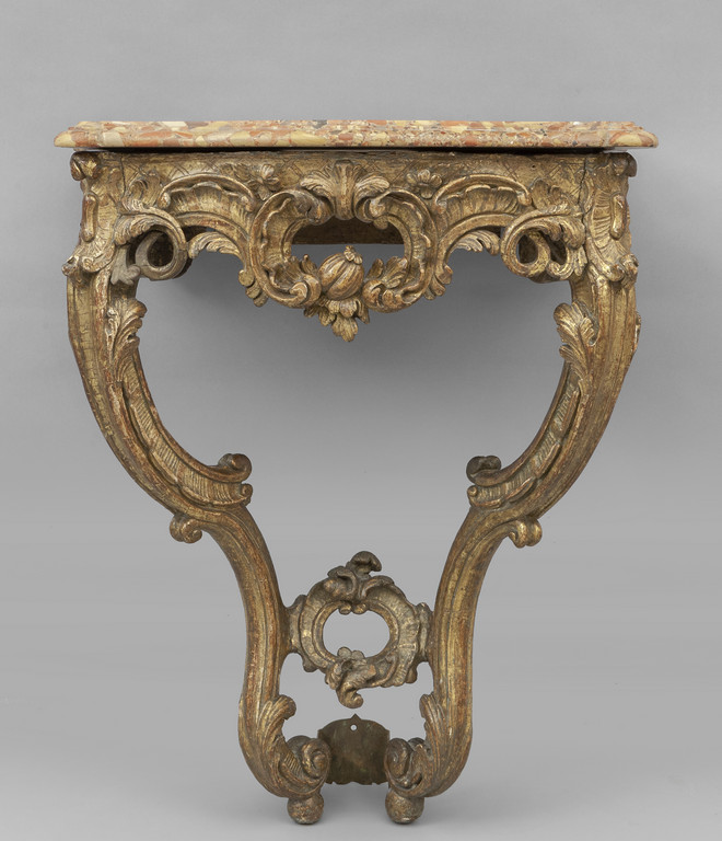 Console a goccia Luigi XV in legno dorato con piano in marmo Francia sec.XVIII
