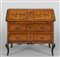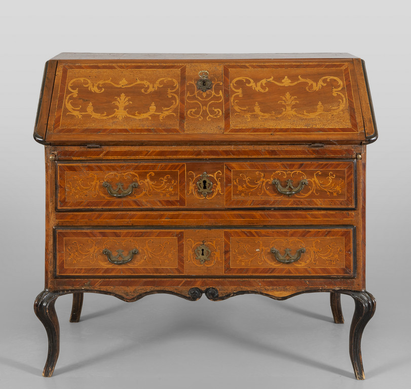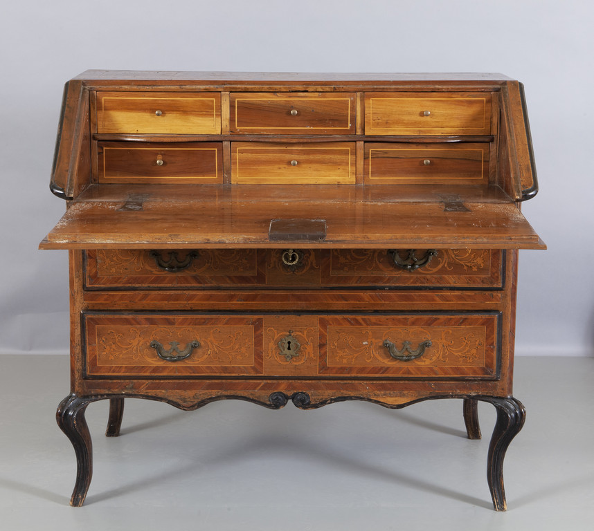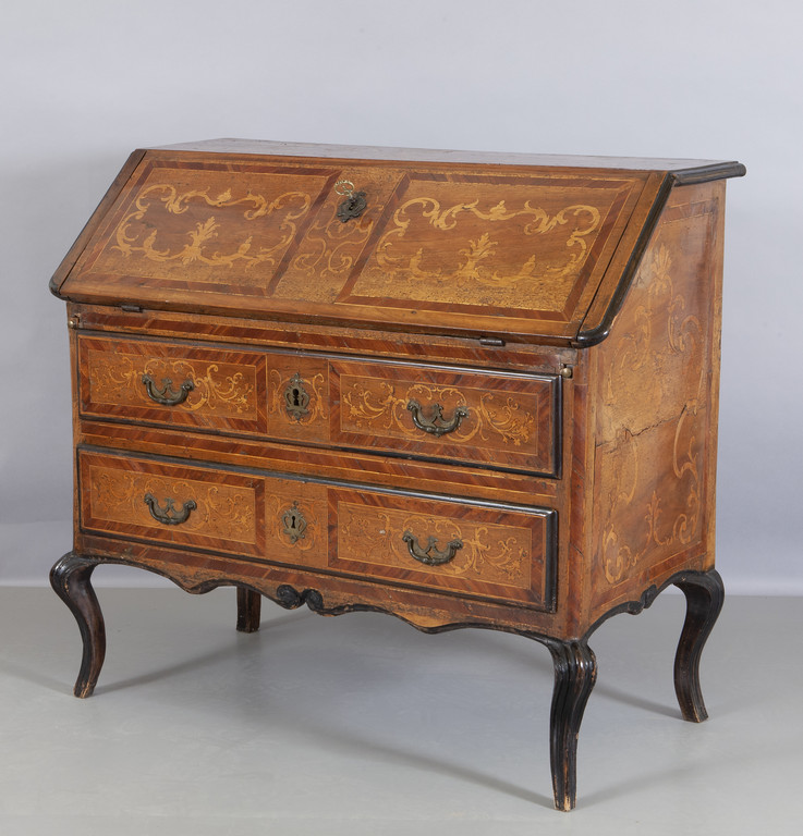 Ribalta Luigi XIV in noce due cassetti con calatoia intarsiata in acero Piemonte sec. XVIII