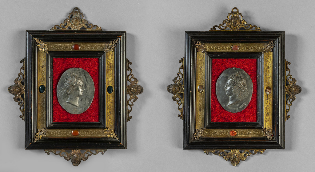 Coppia di cornicette in legno ebanizzato e bronzo dorato intarsiate con corniole sec.XVIII