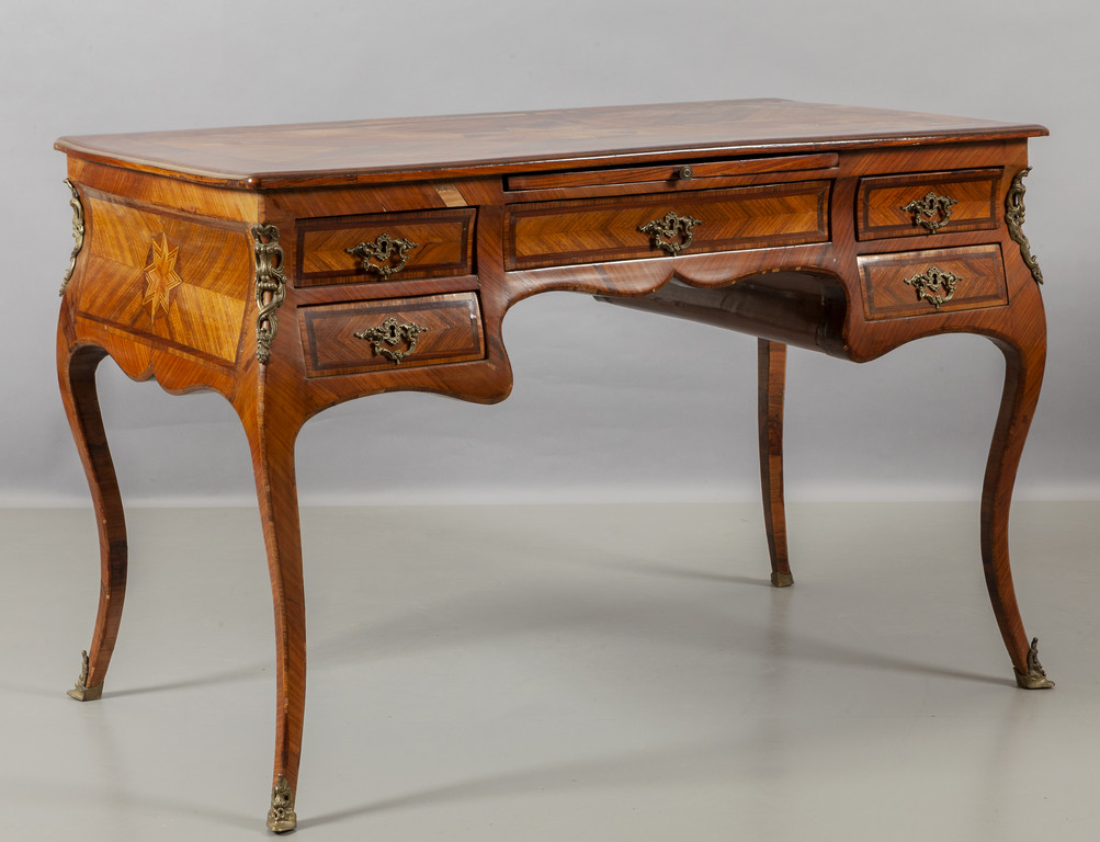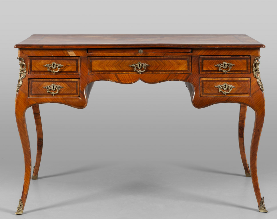 Scrivania in stile Luigi XV lastronata in bois de rose e filettata in palissandro Italia Meridionale fine sec.XIX