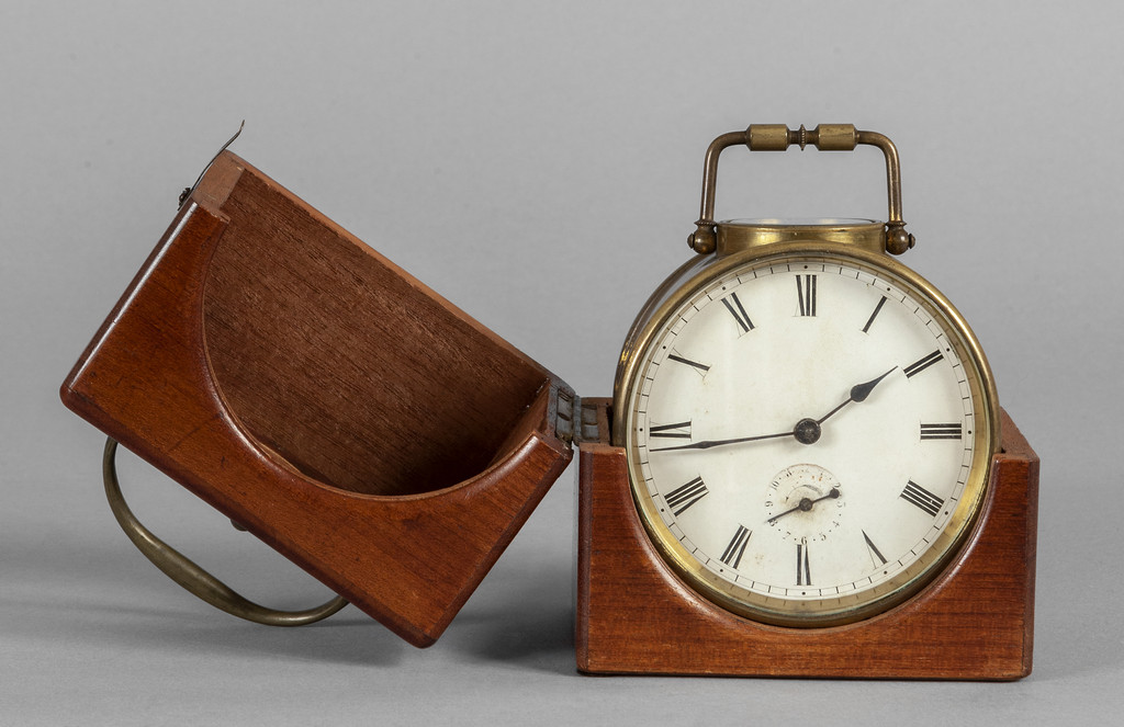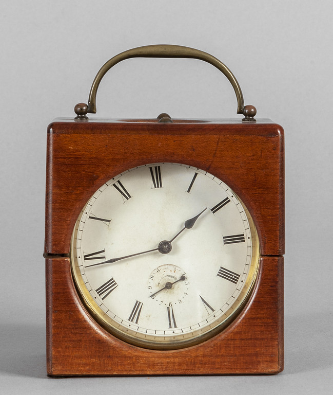 Antico svegliarino in bronzo dorato con custodia coeva in legno macchina f.ta Muller & C. Torino Via San Francesco da Paola 6