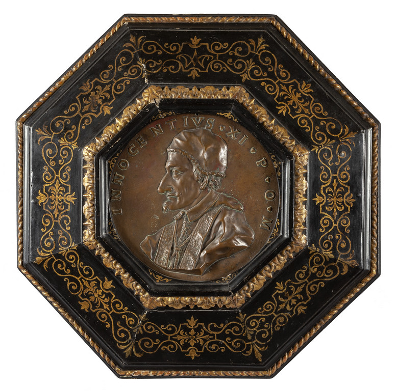 'Papa Innocenzo XI' placca in bronzo di forma rotonda cornice ottagonale in legno intagliato e laccato sec.XVIII