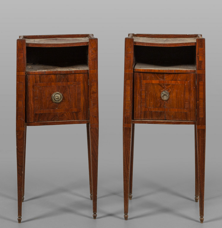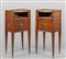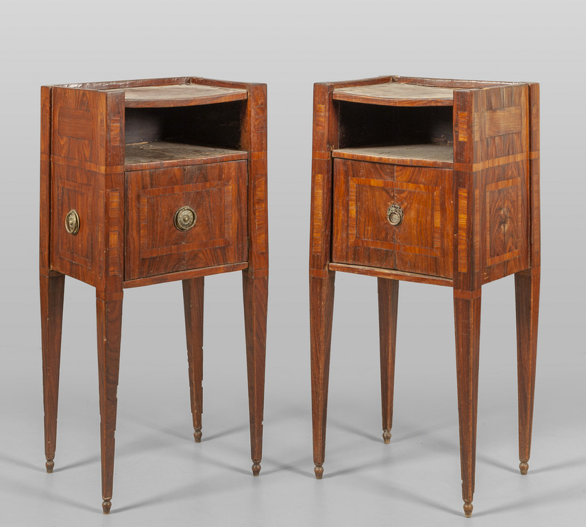 Coppia di comodini direttorio lastronati in noce e filettati in legno di rosa Genova sec.XVIII
