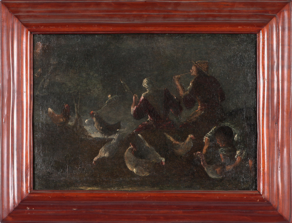 Scuola fiamminga sec.XVII 'Allevatori di polli' olio