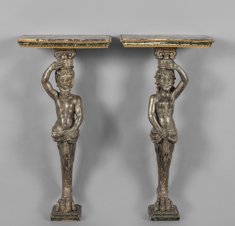 Coppia di mensole in legno finemente intagliato e dorato a mecca raffiguranti fauni sec.XVIII