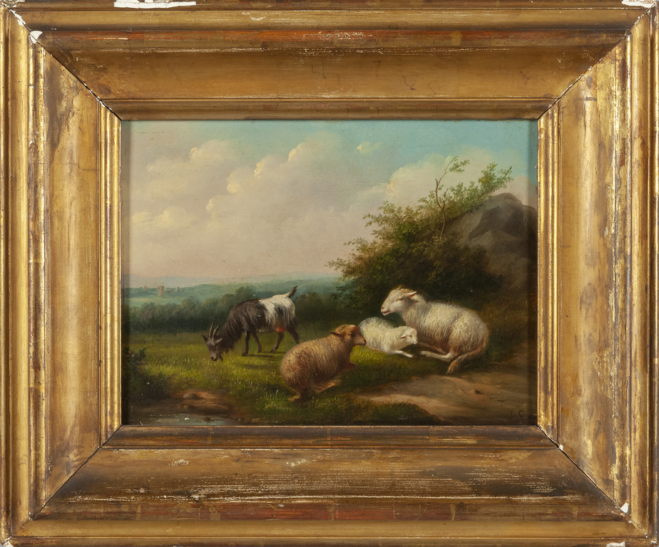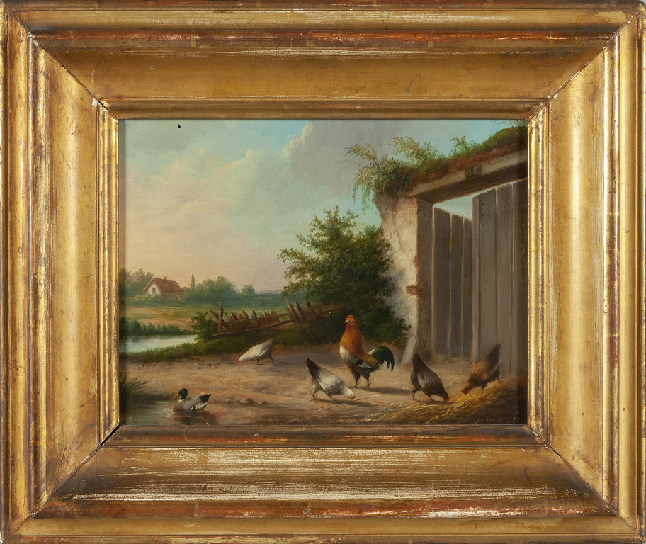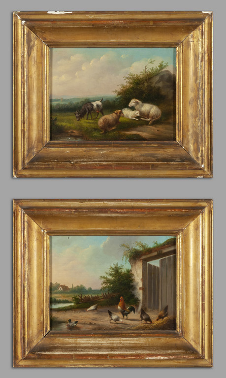 Scuola inglese sec.XIX 'Pecorella al pascolo e galline nell'orto' coppia di olii su tavoletta s.ti in b. a ds. LC