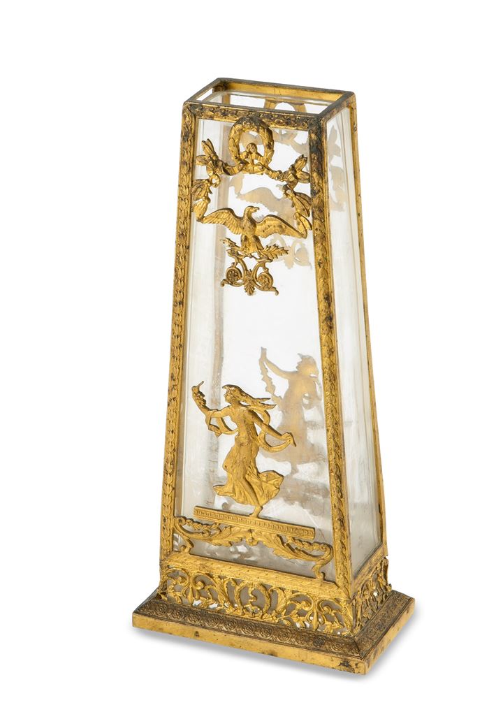 Lot 676 | VASO Vaso piramidale in cristallo guarnito con bronzo dorato, raffigurante...