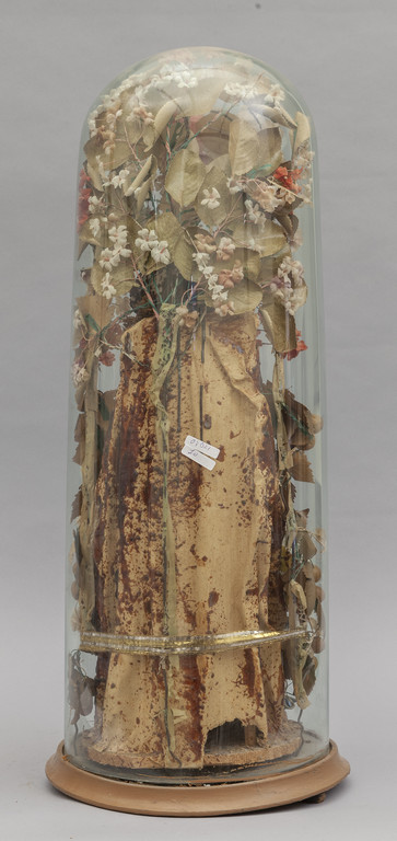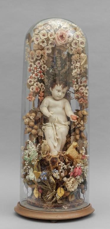 Bambin Gesù scultura in cera su trono di fiori in stoffa sec.XIX dentro teca in vetro