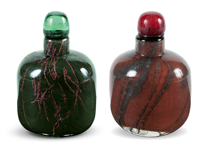 COPPIA DI BOTTIGLIETTE Manifattura anonima, vetri incamiciati nei toni del...