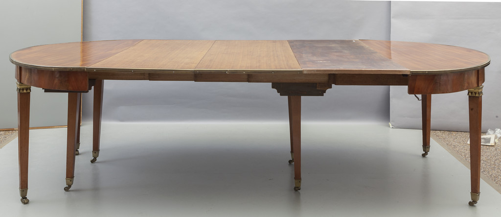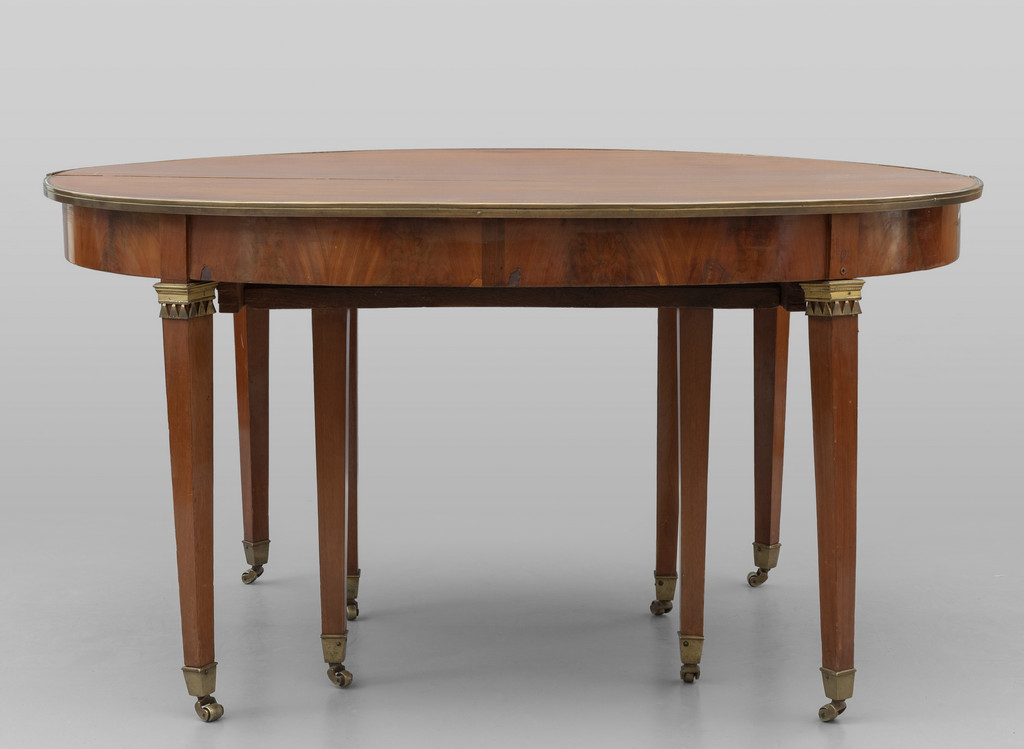 Tavolo da pranzo allungabile di forma ovale in legno di mogano Francia fine sec.XVIII (con tre prolunghe non di epoca)