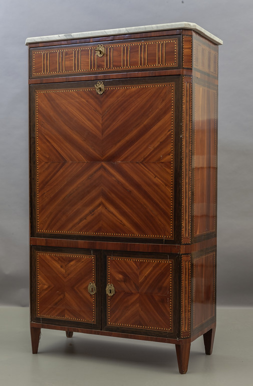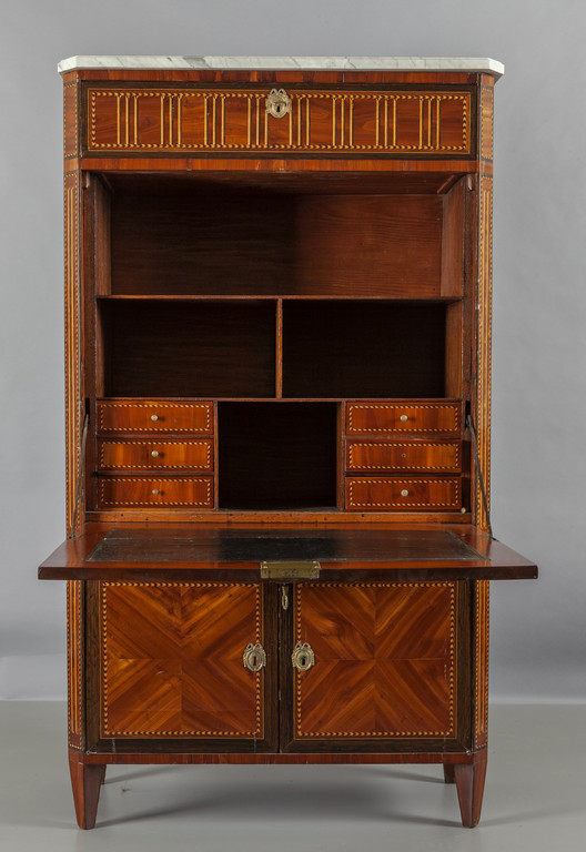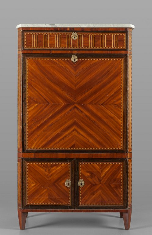 Secretaire Luigi XVI a due sportelli calatoia e cassetto superiore lastronato in legno di rosa e filettato in bosso e palissandro piano in marmo Francia fine sec.XVIII