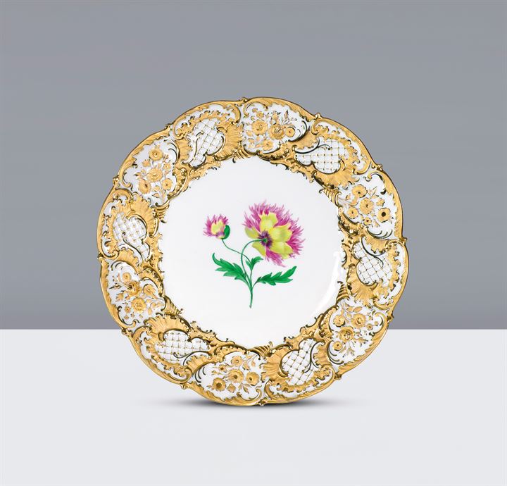 MEISSEN "Piatto bianco con decori floreali oro e delicato fiore centrale"...