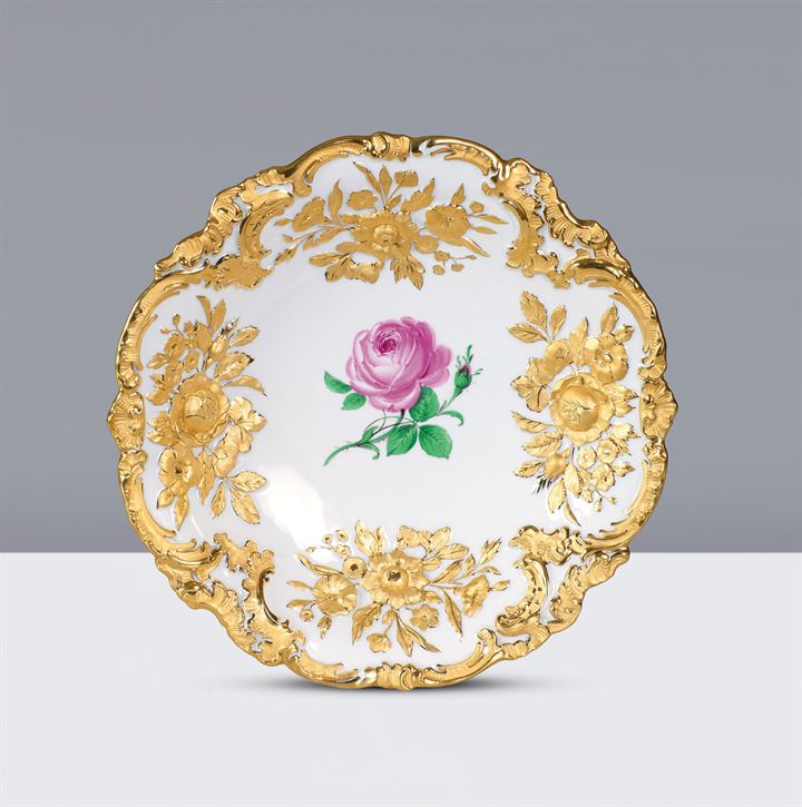 MEISSEN "Piatto bianco decorato con motivi floreali color oro e delicata rosa...