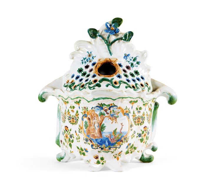 FIORIERA Fioriera in maiolica, Francia XVIII seccolo. A due elementi dipinta...