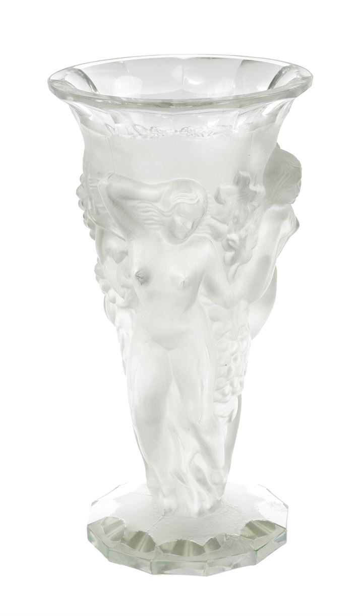 Vaso a balaustro "Bachantes" in vetro bianco e satinato, decoro di nudini femminili a grappoli d'uva.