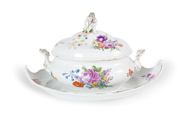 manifattura di Meissen, zuppiera con coperchio sormontato da presa raffigurante un putto, anse laterali,