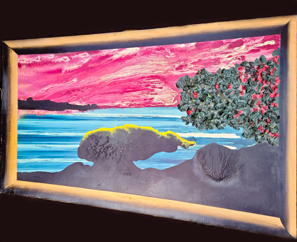 Tecnica mista su tela 120x150 cm, firma e titolo al retro.