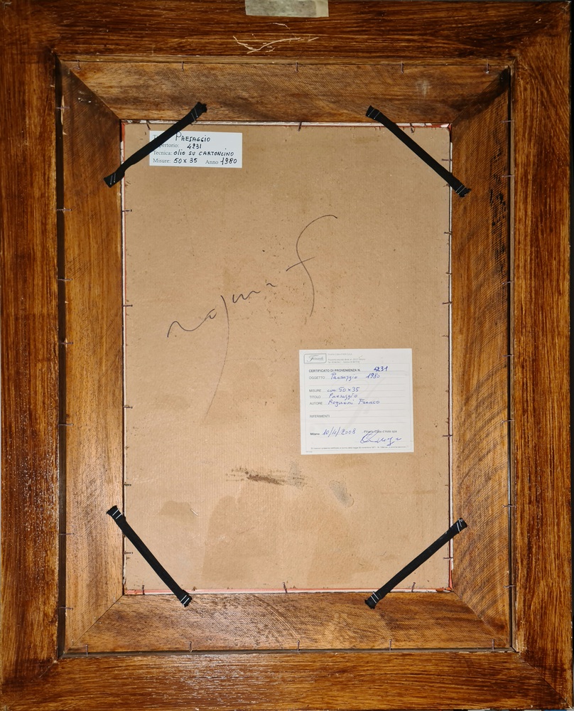 Olio su cartone 35x50 cm, firma in basso a destra, firma al retro.