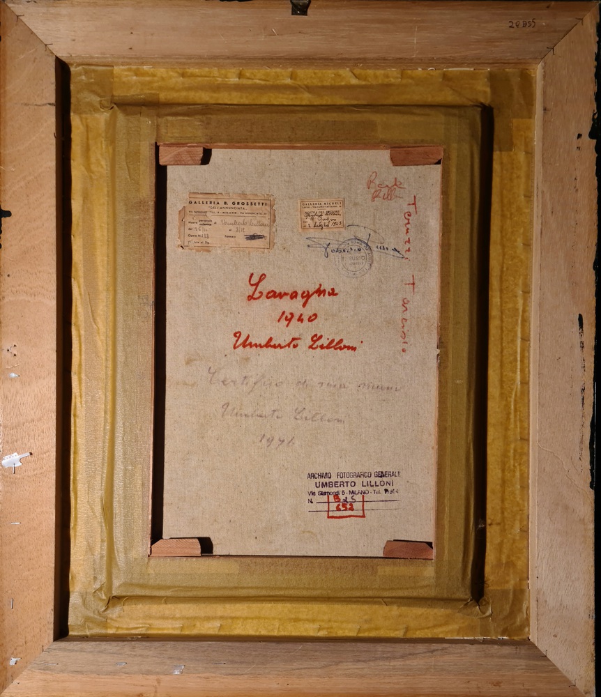 Sul retro: etichetta della Galleria Annunciata (Milano) B. Grossetti; etichetta della Galleria Micheli (Lecco), timbro Galleria F.Russo (Roma) e timbro dell'Archivio Fotografico Generale Umberto Lilloni con n. d'archivio 652I e dichiarazione d'autenticità dell'artista.