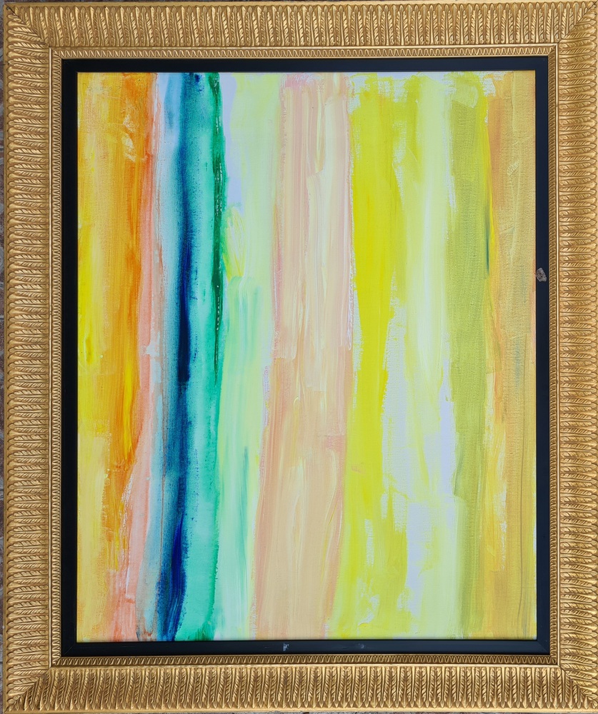 Acrilico su tela 100x81 cm, firmato in basso a destra, firma, titolo e anno al retro.