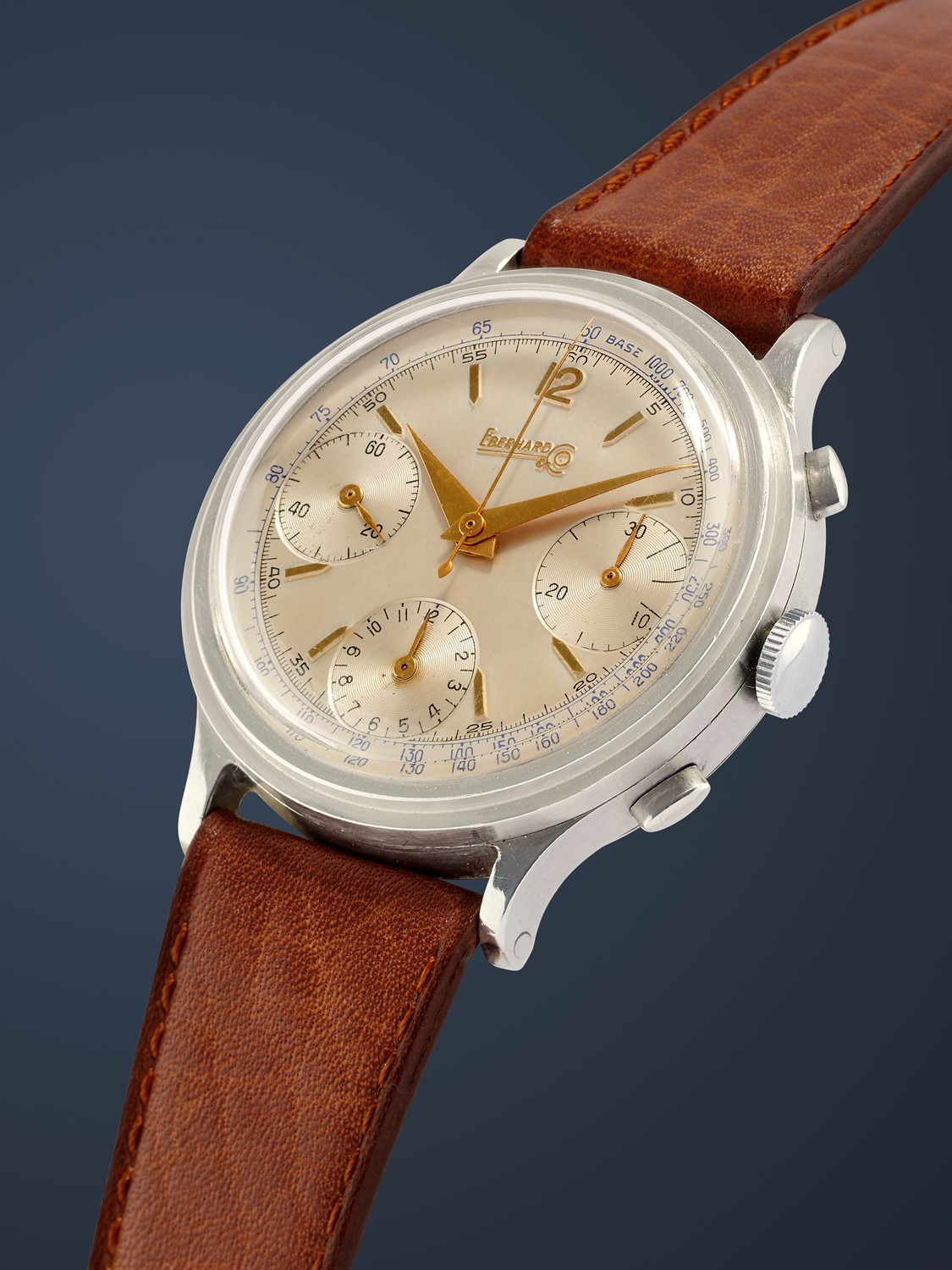 Cassa rotonda in acciaio, lunetta a gradini, pulsanti a oliva.