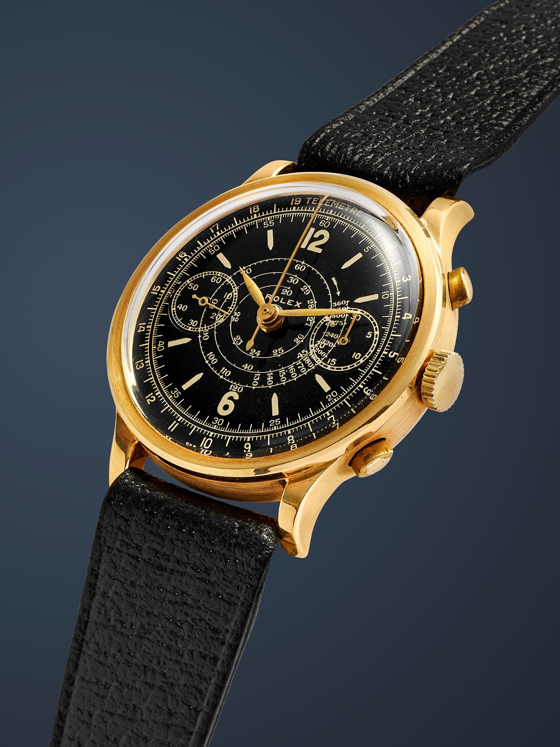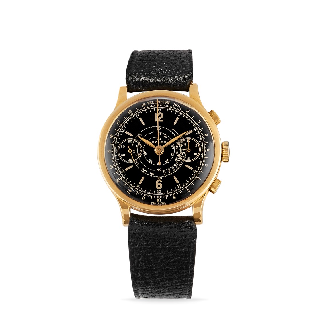 Note: Introdotta a metà anni '30, la referenza 2508 fu il primo cronografo Rolex con due contatori e due pulsanti per l'attivazione della cronografia.Il modello viene generalmente diviso in due serie: la prima serie é contraddistinta da pulsanti a oliva e una dimensione di cassa maggiore, la seconda presenta pulsanti rettangolari e un diametro di cassa leggermente più contenuto.