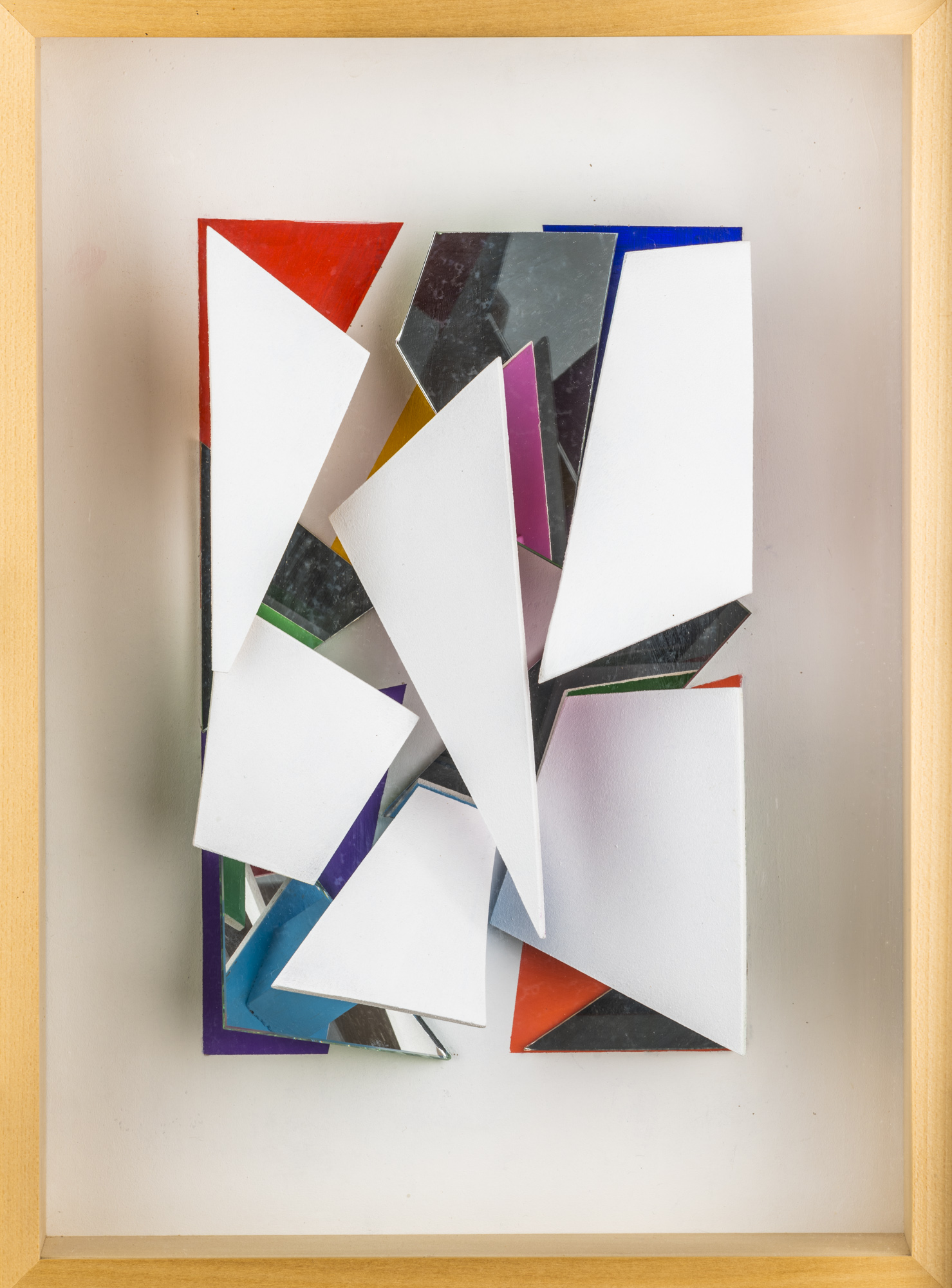 Assemblaggio, pittura, specchio e legno in box di legno, cm. 45 x 33 x 8