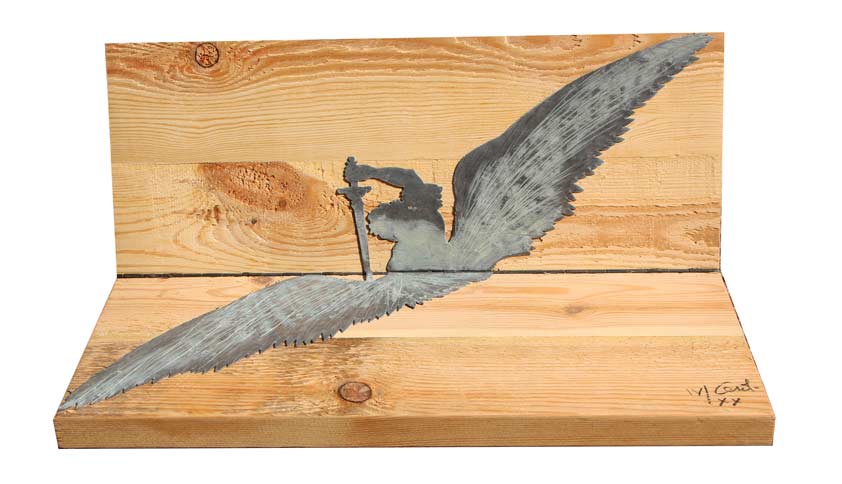 Mario CEROLI Castel Frentano 1938 L’angelo vendicatore, 1997 Lastra di piombo intagliata a mano aplicata su legno cm 20 X 45 X 18 Certificato di garanzia dell’Editore Giampaolo Prearo, Artisti&Artisti