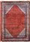 Tappeto fondo rosso con cantonali bianchi racchiusi da molteplici bordure, con fitto disegno minuto a tutto campo, 142x106
