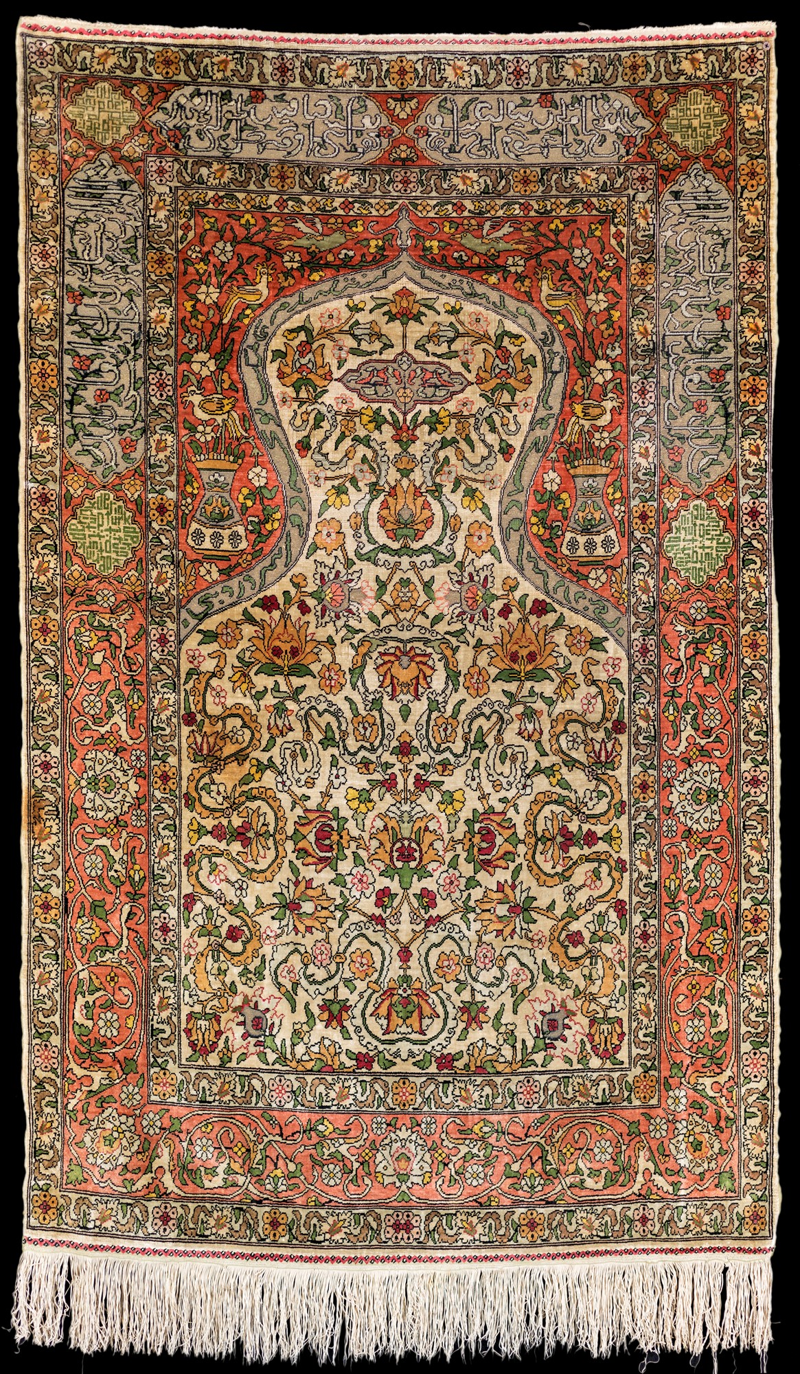 Preghiera turca di Hereke in seta, Anni Quaranta/Cinquanta con inserti di fili metallici dorati e fitta decorazione a volute e motivi floreali su fondo beige; cornice rossa caratterizzata da riserve con iscrizioni di alcuni passi del Corano, 148x95
