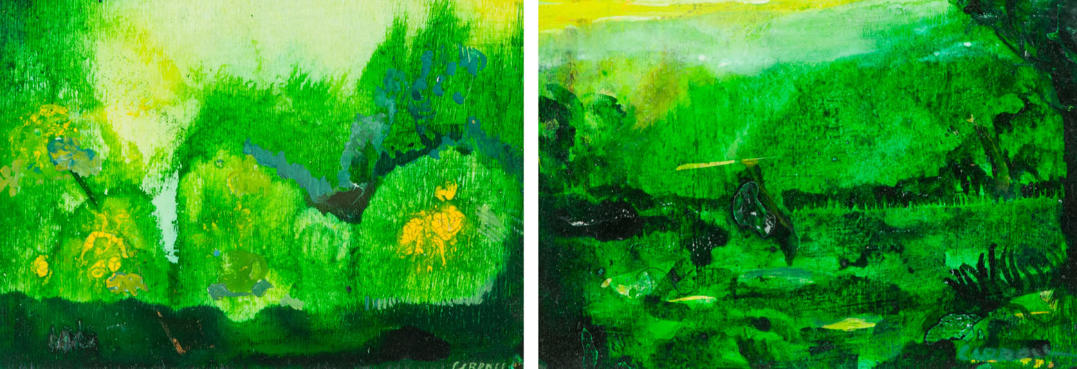 Robert Carroll Lotto unico di due Opere - "Forest birth", Tecnica mista su tavola, cm. 15x20, firmato in basso a destra, sul verso: firma e titolo; - "Senza titolo", Tecnica mista su tavola, cm. 14,5x20, firmato in basso a destra, sul verso: firma.