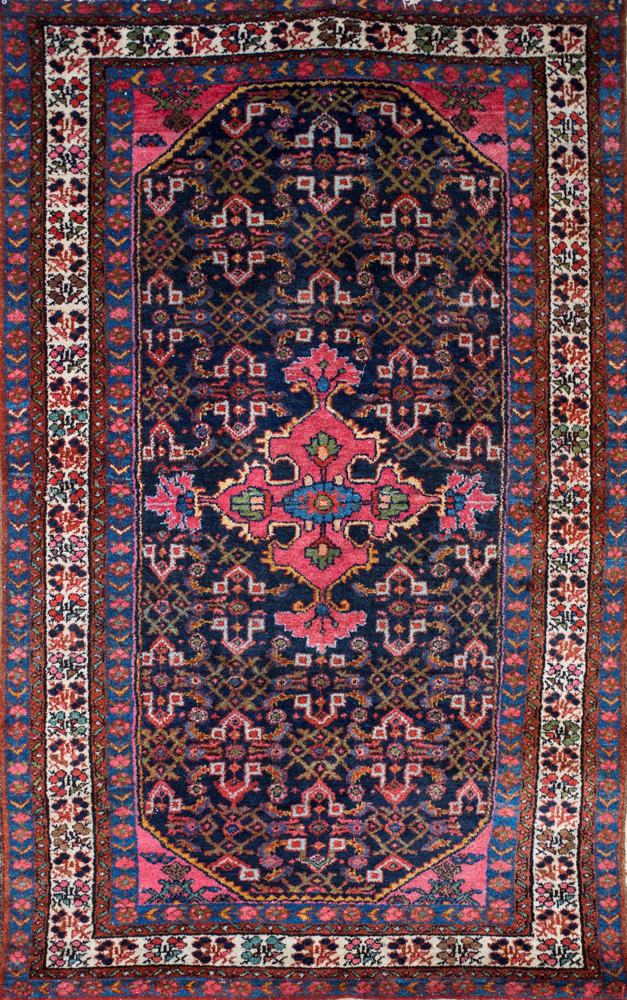 Tappeto Persiano fondo blu a disegno stilizzato, con medaglione centrale e cantonali rosa racchiusi da cornice principale bianca , 215x133