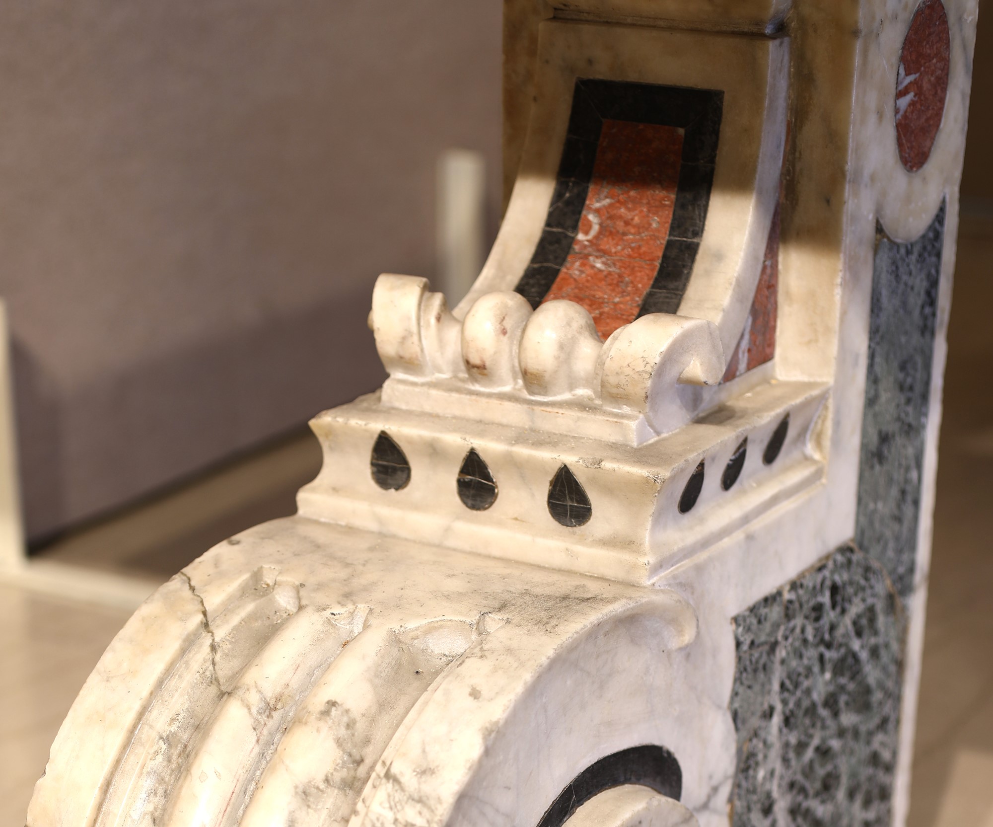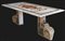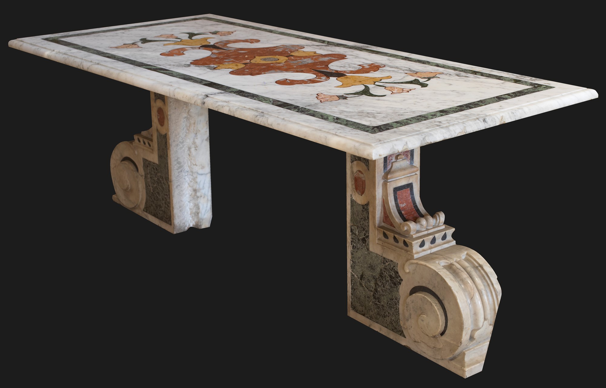 Tavolo in marmo con piano rettangolare in commesso su due antiche mensole , 73x190x90
