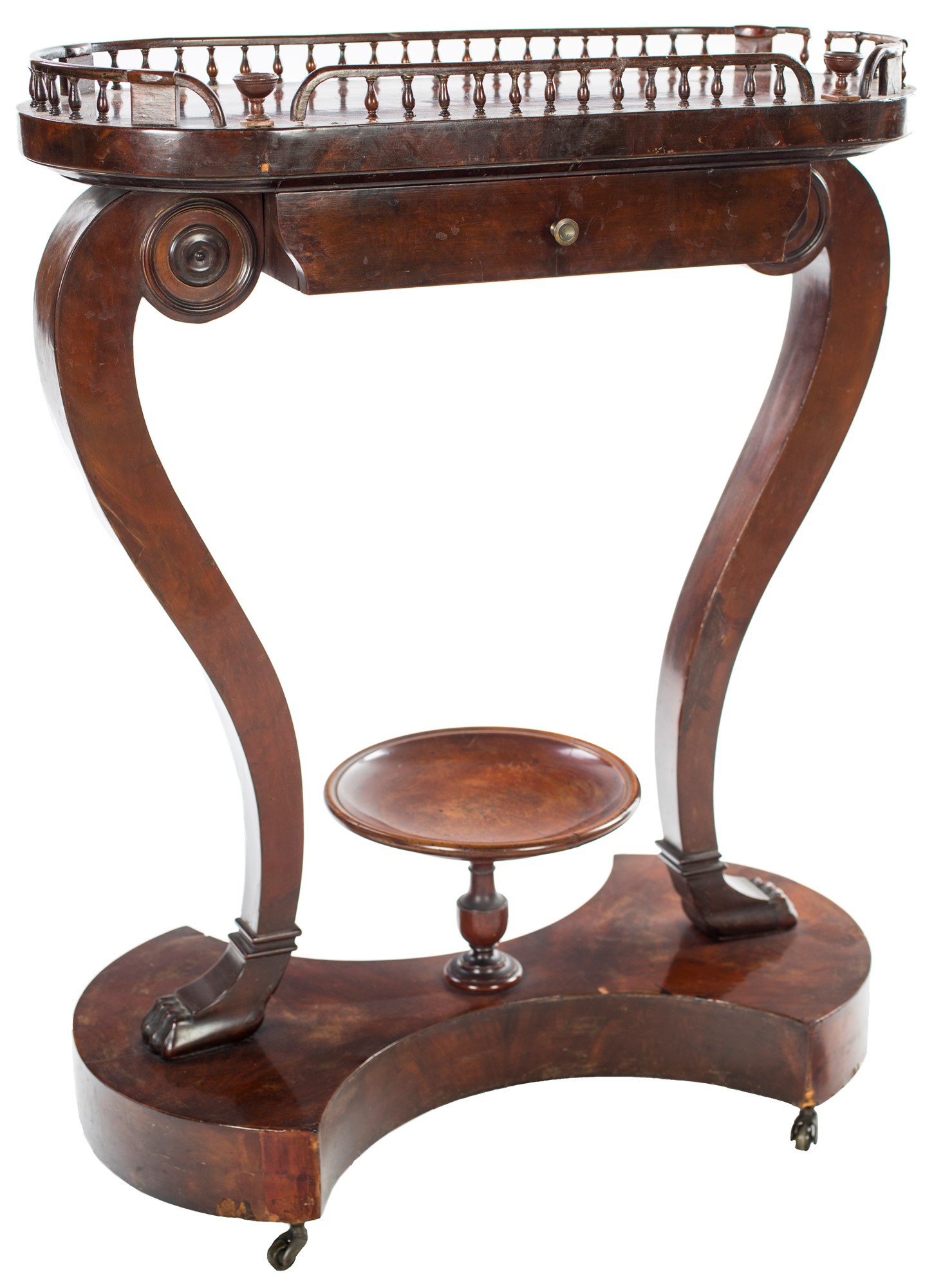 Guéridon in mogano con piano sagomato, XIX secolo racchiuso da ringhierina lignea; un cassetto nella fascia, montanti laterali sagomati con estremità superiore a ricciolo, poggianti su base sormontata da un'alzatina, 75x59x31