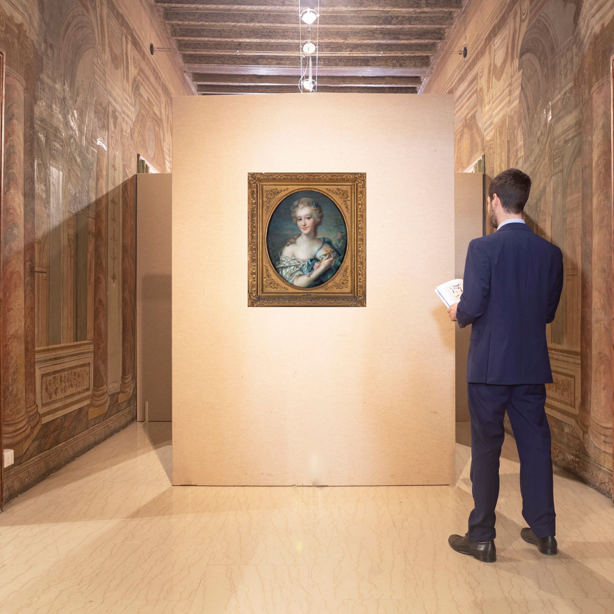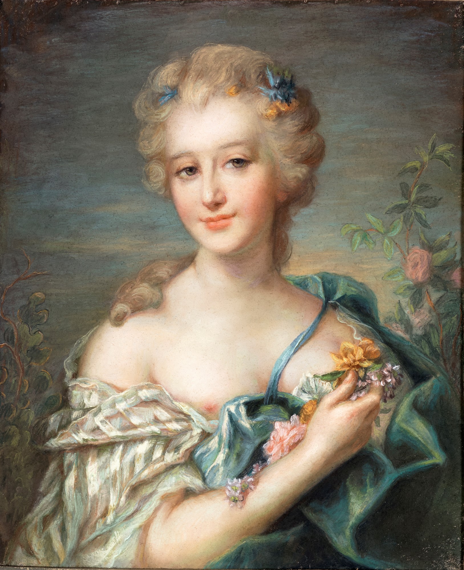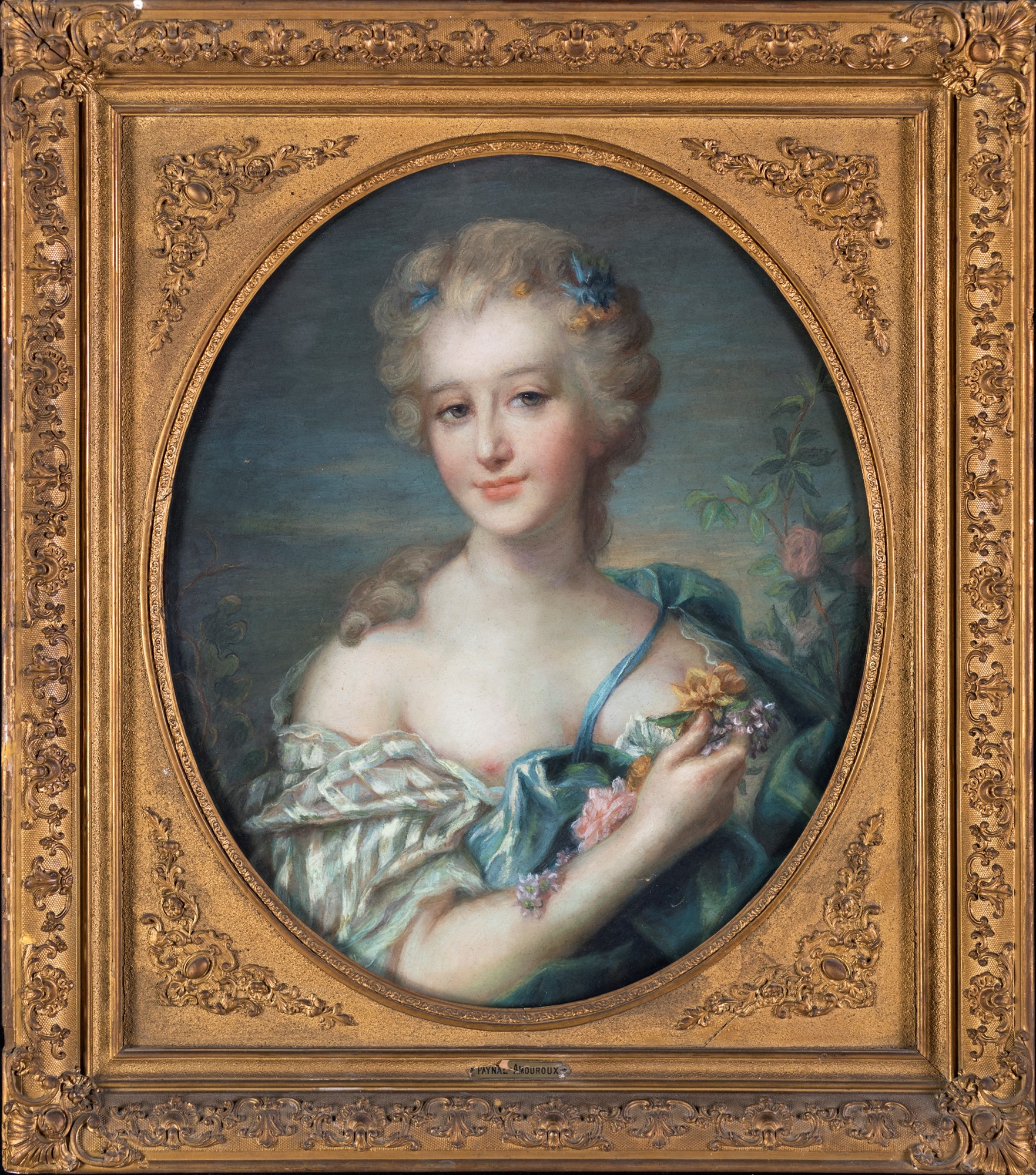 Jean-Marc Nattier (cerchia), Jean-Marc Nattier (cerchia), Ritratto di gentildonna raffigurata come Flora Entro cornici in legno dorato a luce ovaletempera su carta , 63x53