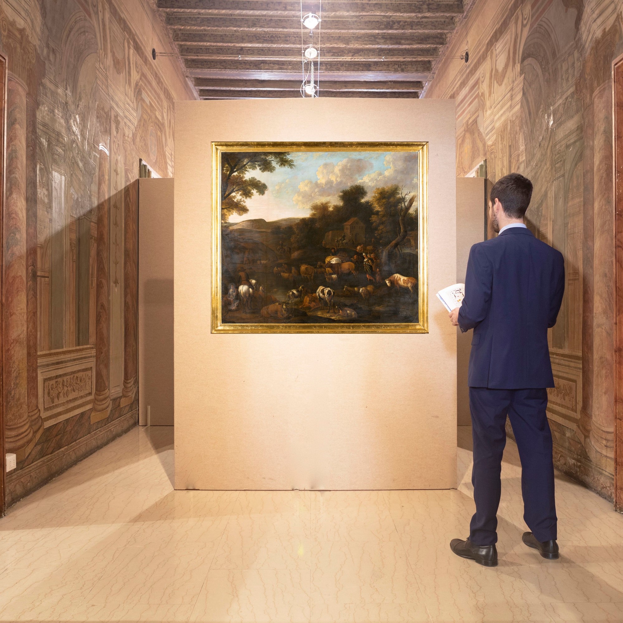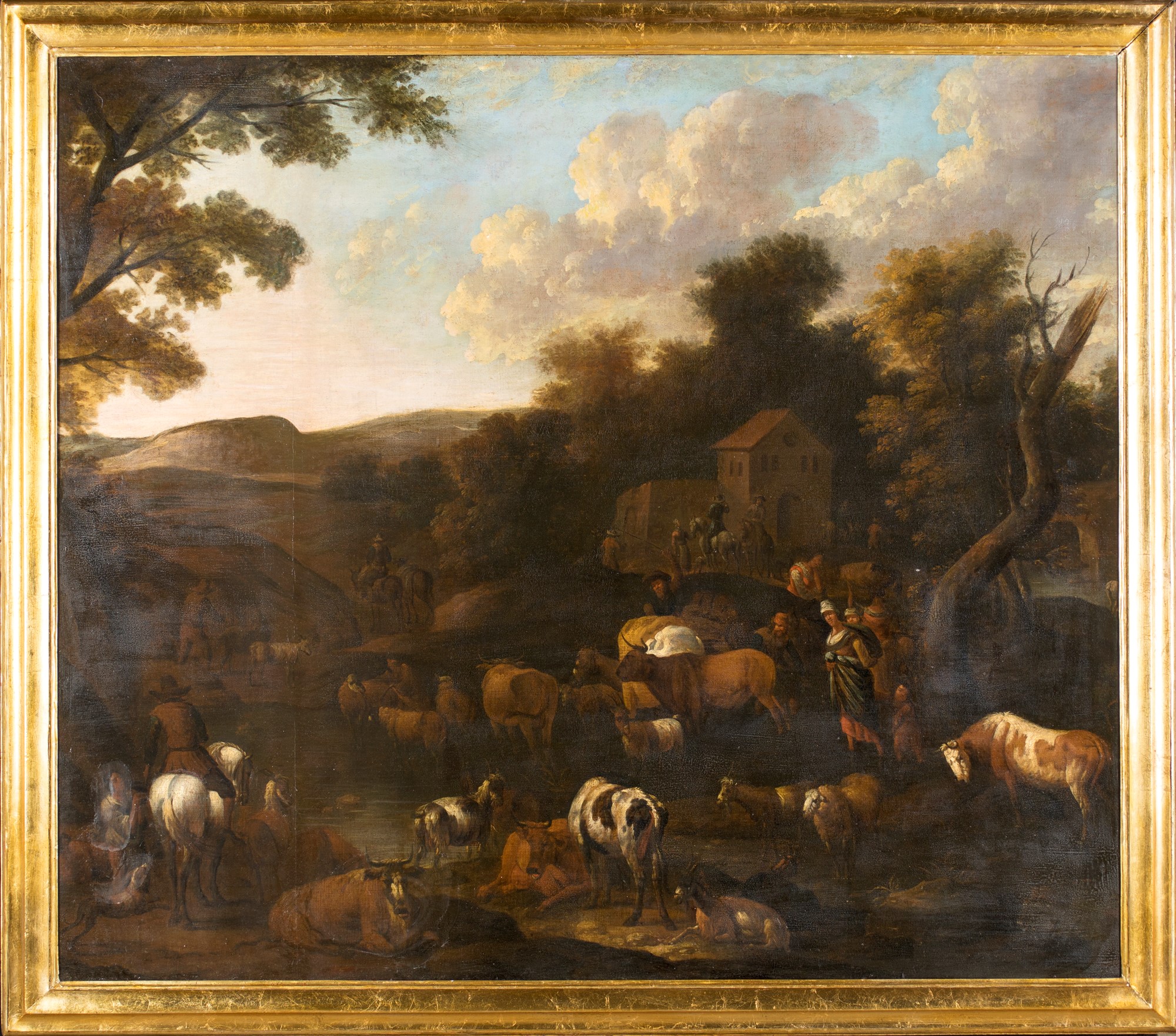 Scuola Fiamminga del XVII secolo, Paesaggio con armenti olio su tela, 115x135