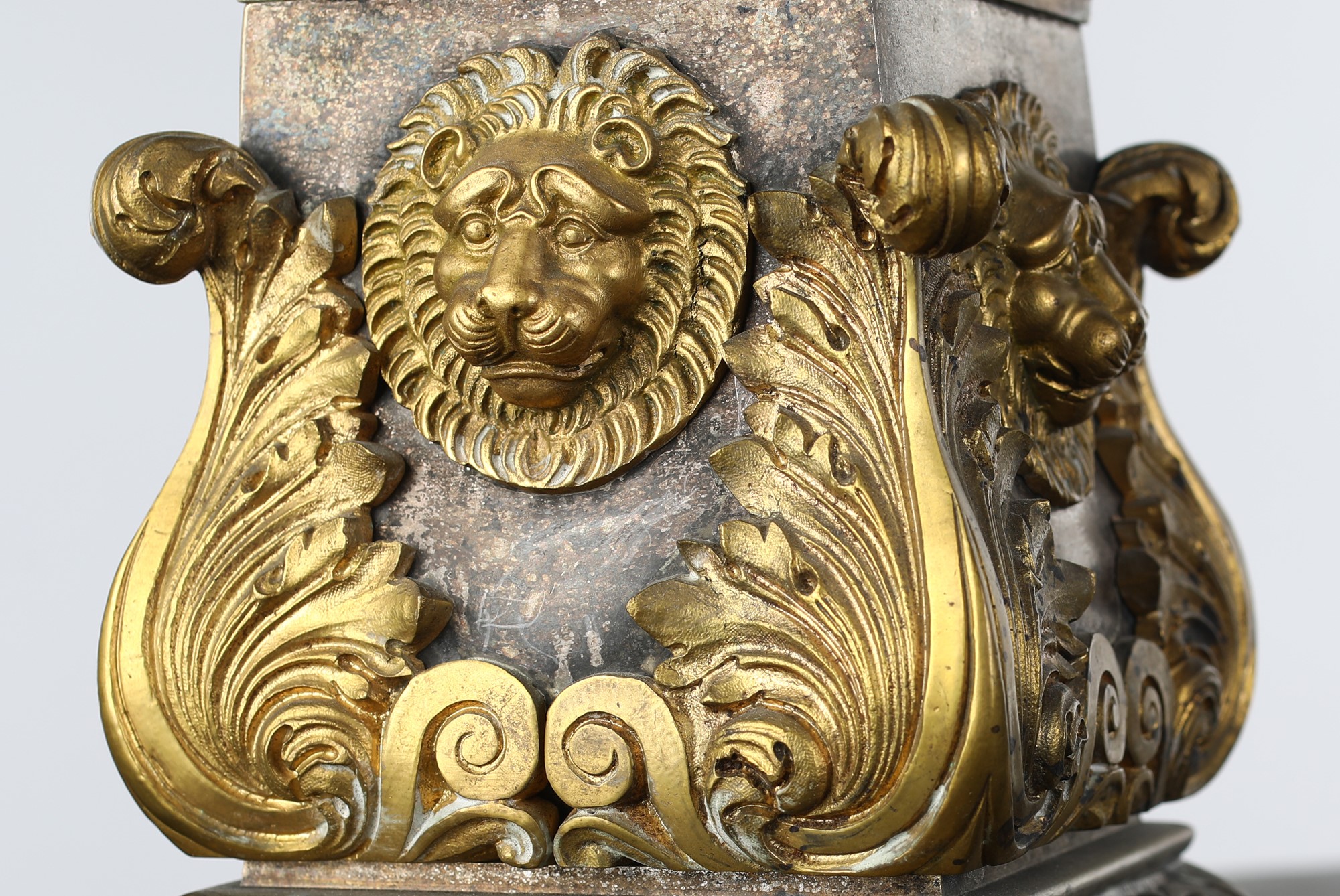Coppia di grandi candelabri in bronzo argentato e dorato a sette luci, primo quarto del XIX secolo bracci sagomati emergenti da un vaso posto sulla sommità di una colonna con fusto scannellato calzata in un cespo fogliaceo; piedistallo decorato da mascheroni leonini e rilievi vegetali angolari minuziosamente resi, altezza cm 107