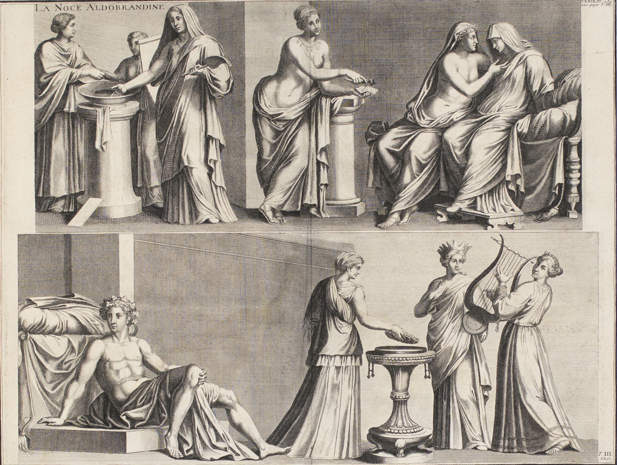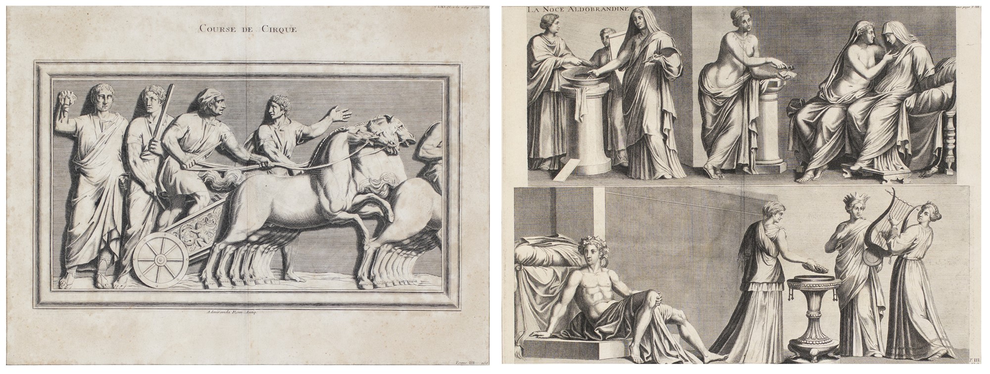 a) Le nozze Aldobrandini b) Course de Cirque Entrambe tratte dall'opera Admiranda romanarum antiquitatum dell'incisore Pietro Santi Bartoli due acquaforti, 33x42 ca il foglio - con la cornice. cm 69x74