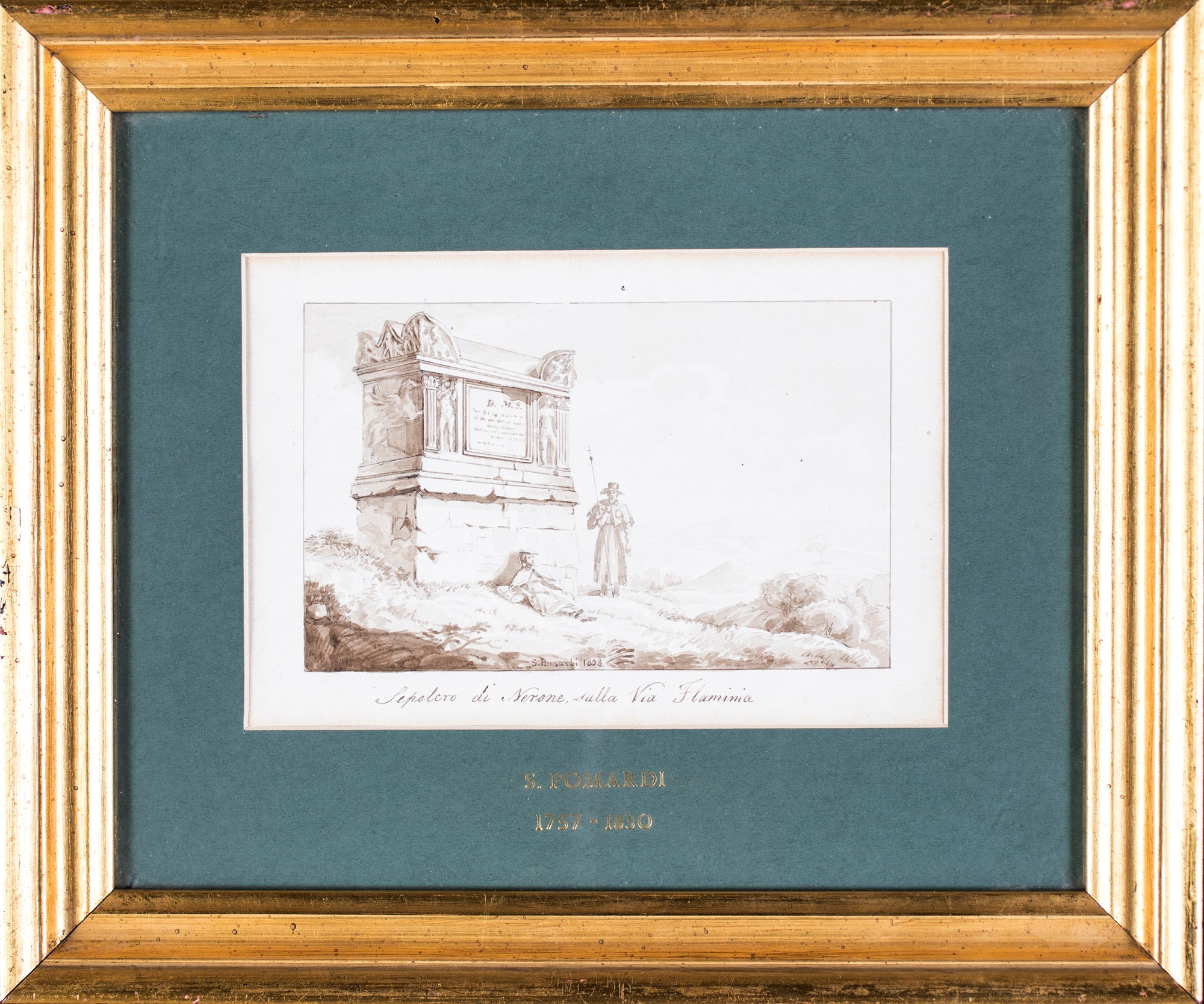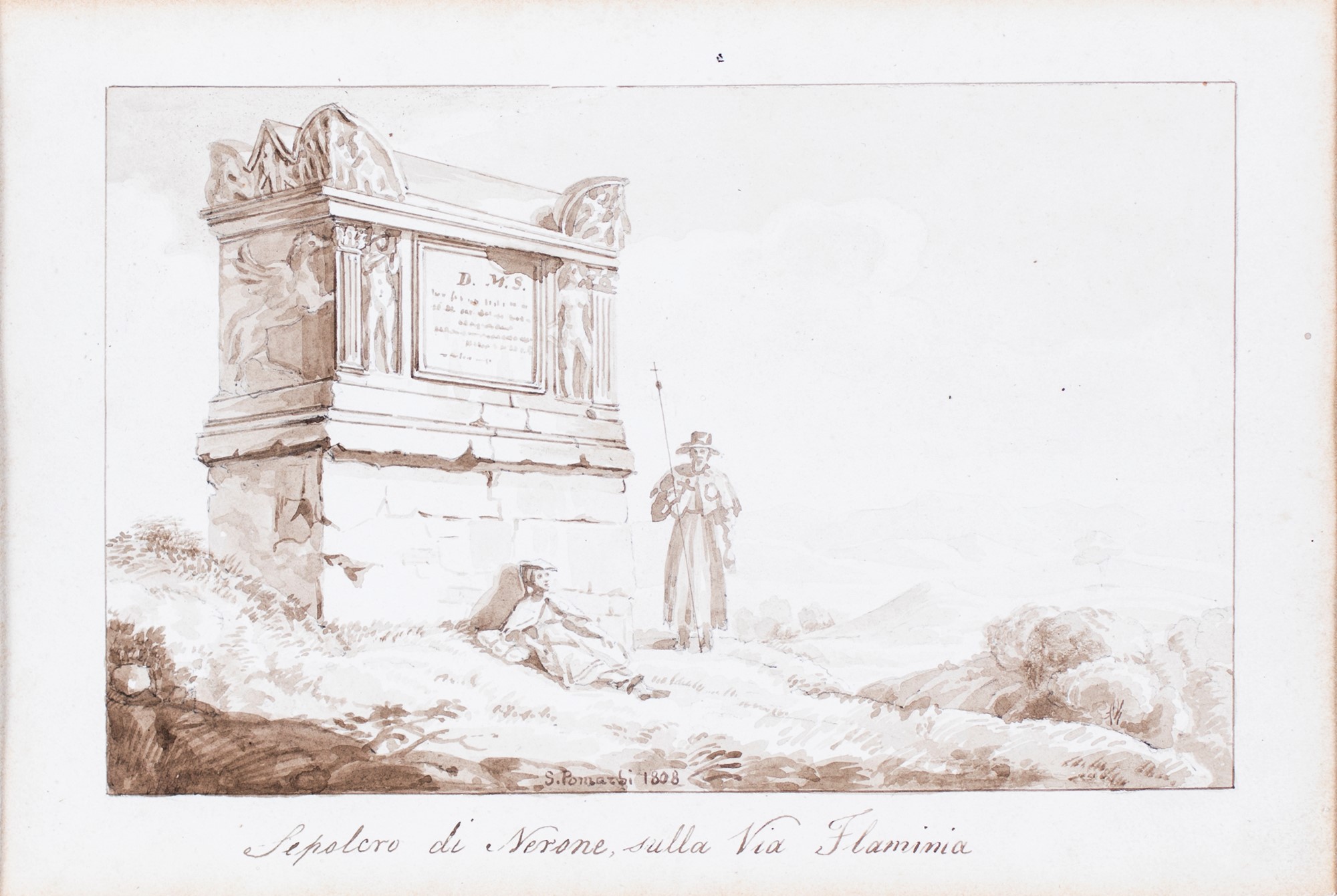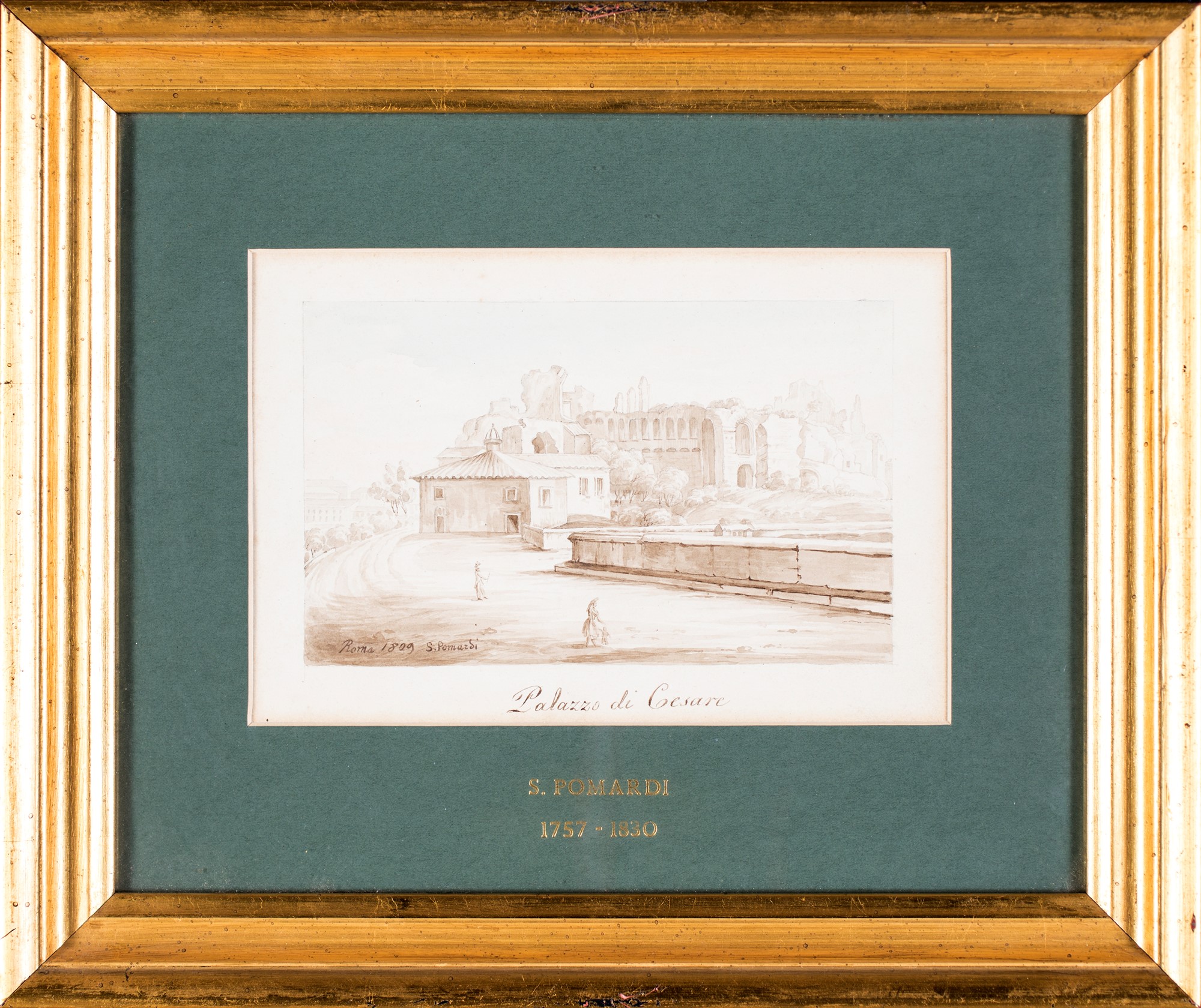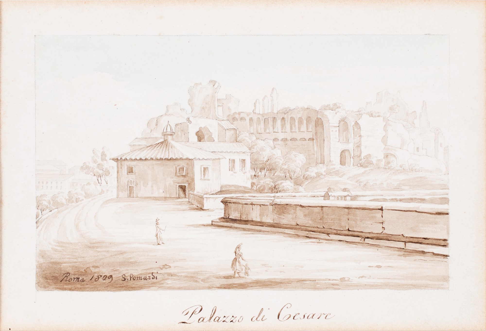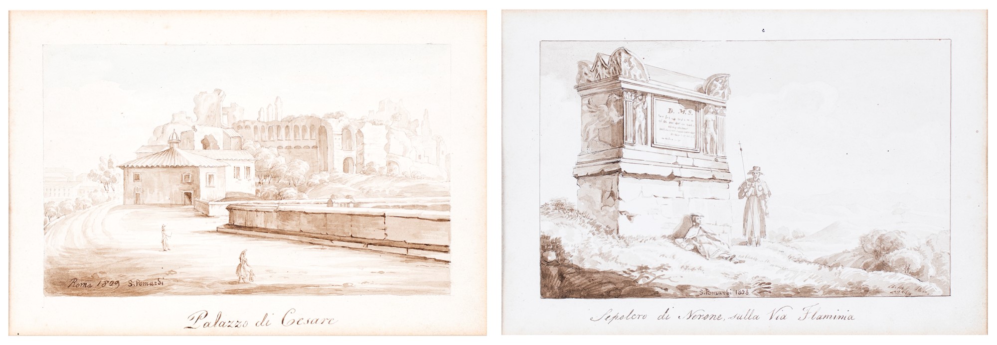 Simone Pomardi, a) Sepolcro di Nerone sulla Via Flaminia b) Palazzo di Cesare Il primo firmato e datato in basso al centro: S. Pomardi 1808; il secondo firmato e datato in basso a sinistra: S. Pomardi Roma 1809coppia di acquerelli monocromi, 15x22