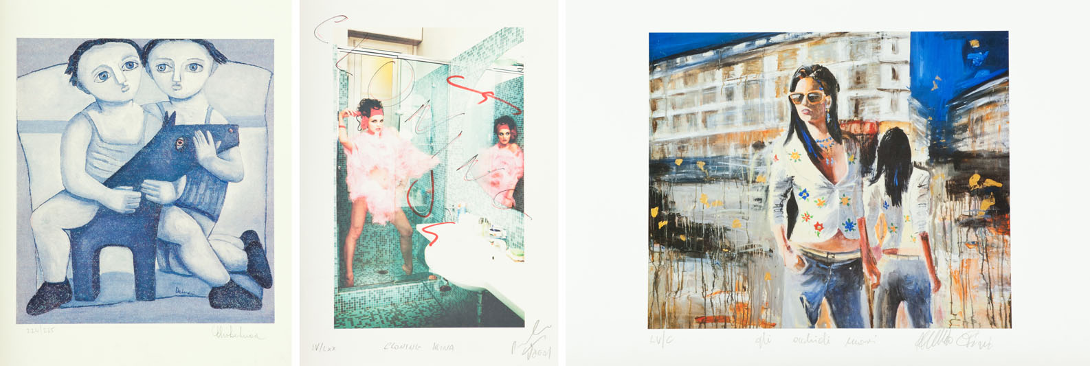 De Luca Elio, Vegas Paolo, Pini Alfredo Lotto unico di tre opere - "Elio De Luca", Bambini con cane, Litografia su carta, cm. 44x35, es. 224/225, firma in basso a destra, tiratura in basso a sinistra; - "Paolo Vegas", Cloning Irina, Serigrafia su carta, cm. 29,7x21, es. IV/LXX, firma in basso a destra, tiratura in basso a sinistra, titolo in basso al centro; - "Alfredo Pini", Gli occhiali nuovi, serigrafia su carta, cm. 34x47, es. LV/C, firma in basso a destra, tiratura in basso a sinistra, titolo in basso al centro.