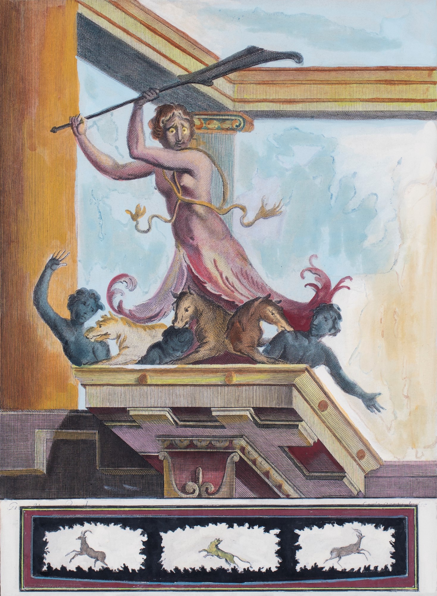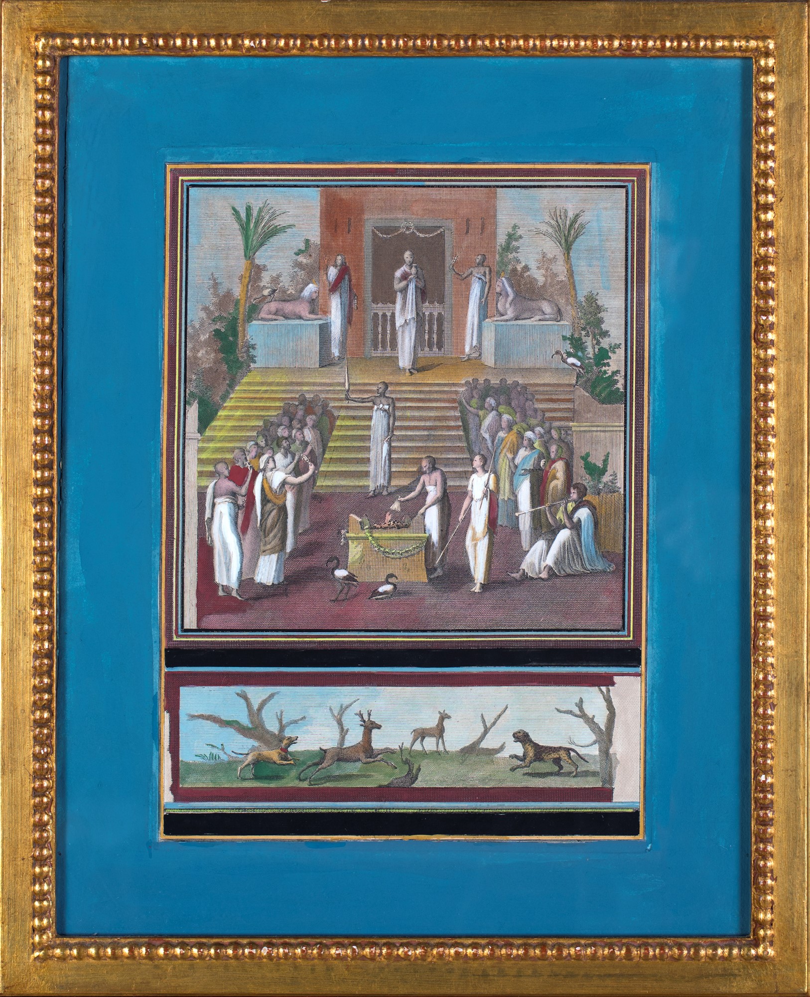 Quattro incisioni acquerellate, fine del XVIII secolo da "le Antichità di Ercolano esposte". Pietro Campana (1725 - 1765) incisore - Niccolò Vanni (notizie 1750 - 1770 ca.) disegnatoreacquaforte acquerellata a mano, 33x23 - con la cornice: cm 49x40