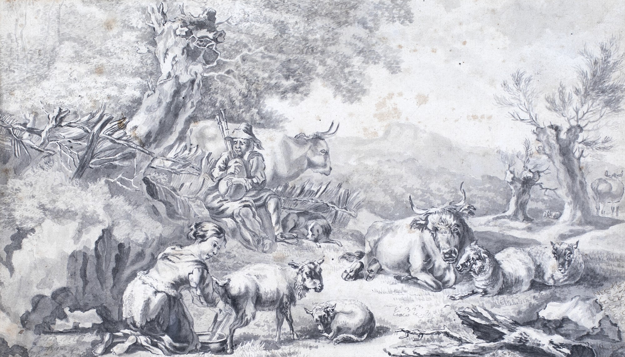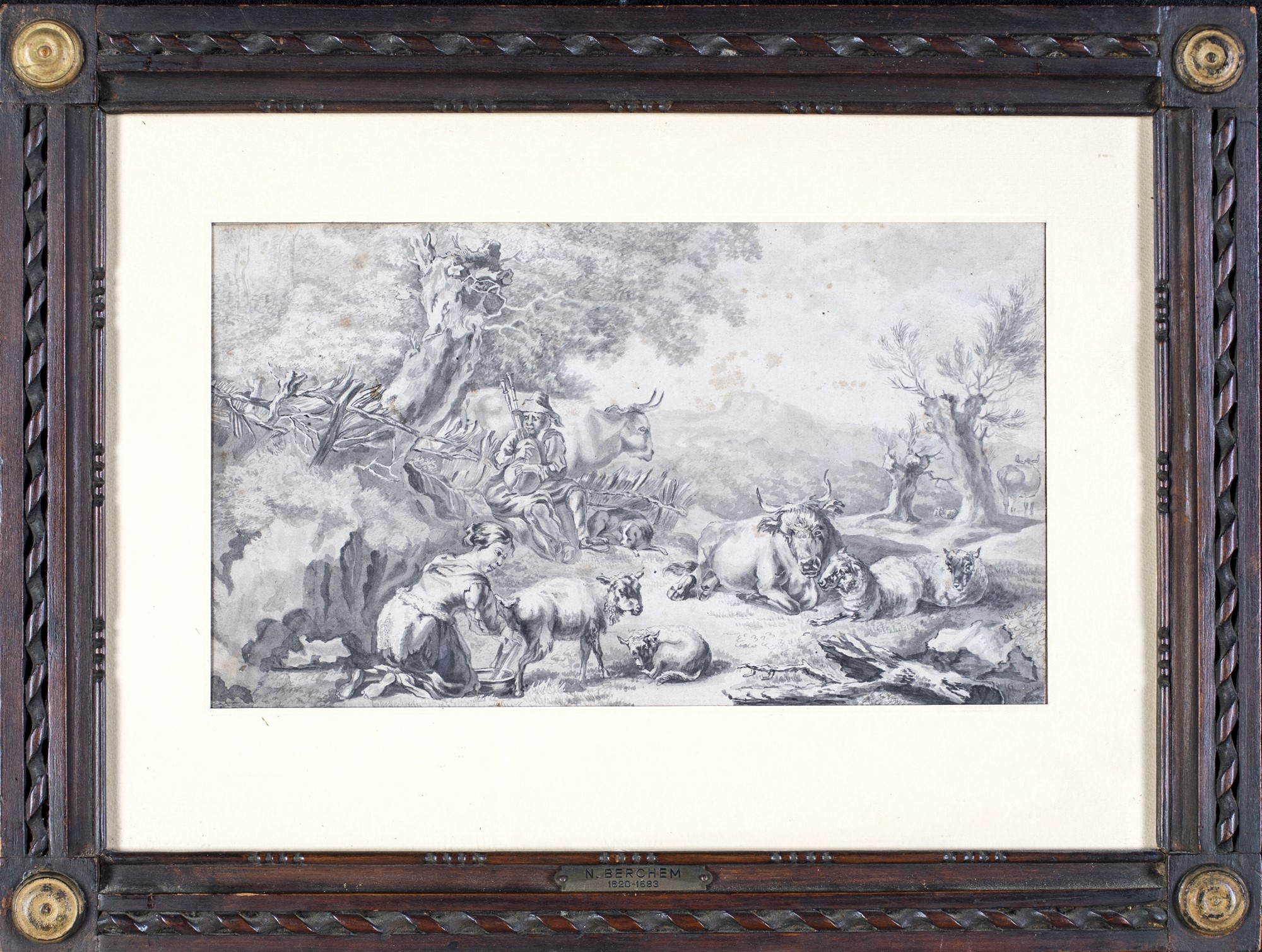 Nicolaes Pietersz Berchem, Scena campestre con figure, animali e rovine Provenienza: già Antichità Lukacs - Donath, Romaacquerello monocromo su carta, 19x32,5