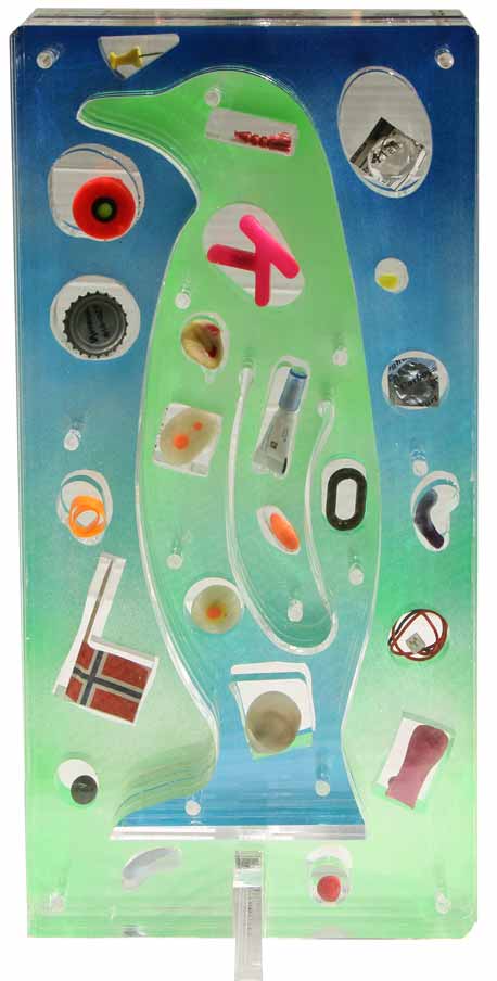 Renzo NUCARA Crema 1948 Stratofilm pinguino, 2010 Plexiglass, resine, oggetti cm 40 X 20 X 6 Autentica dell’artista su fotografia