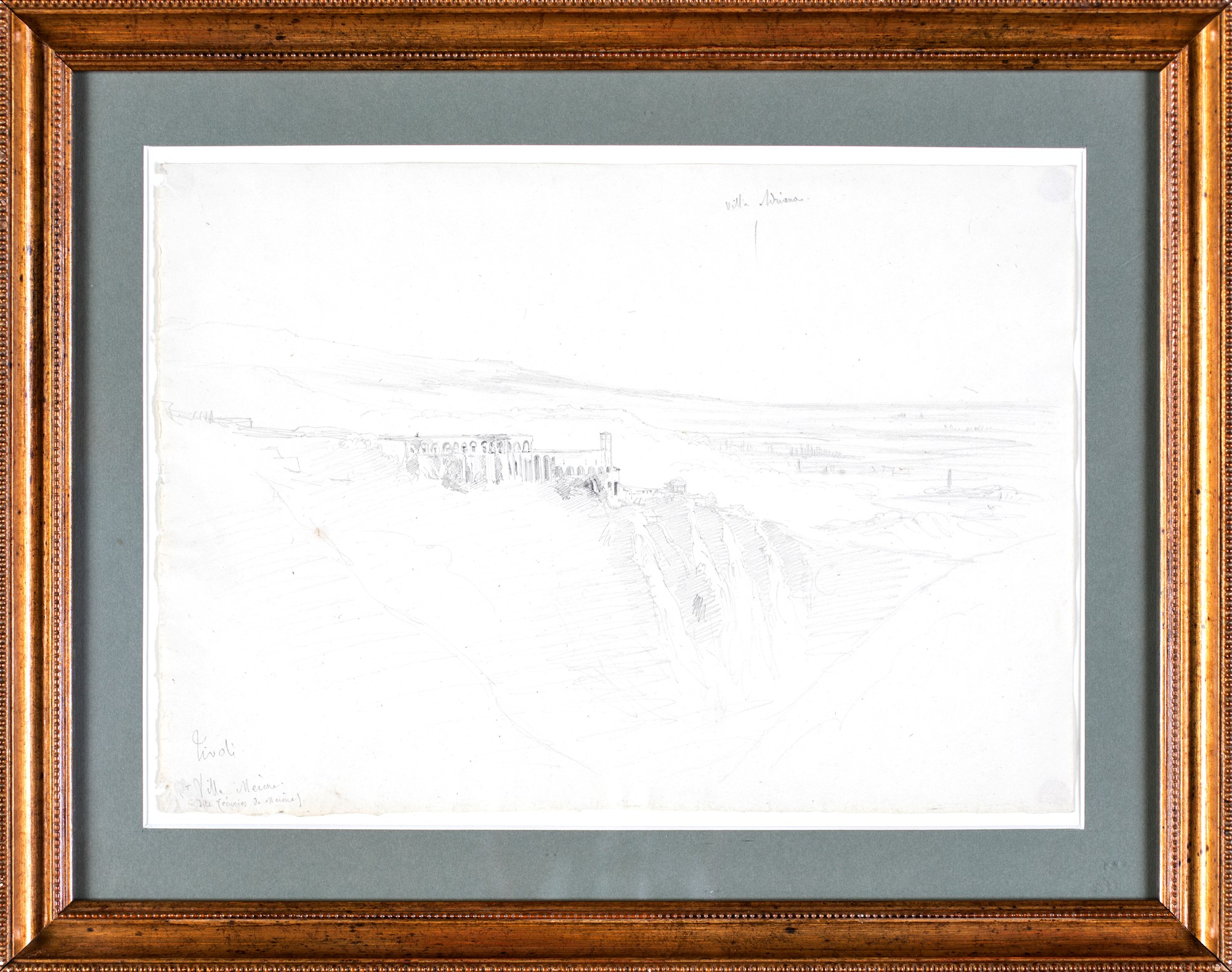 Scuola francese del XIX secolo , Veduta di Tivoli con le cascatelle e la villa di Mecenate F2, matita su carta, 26x37