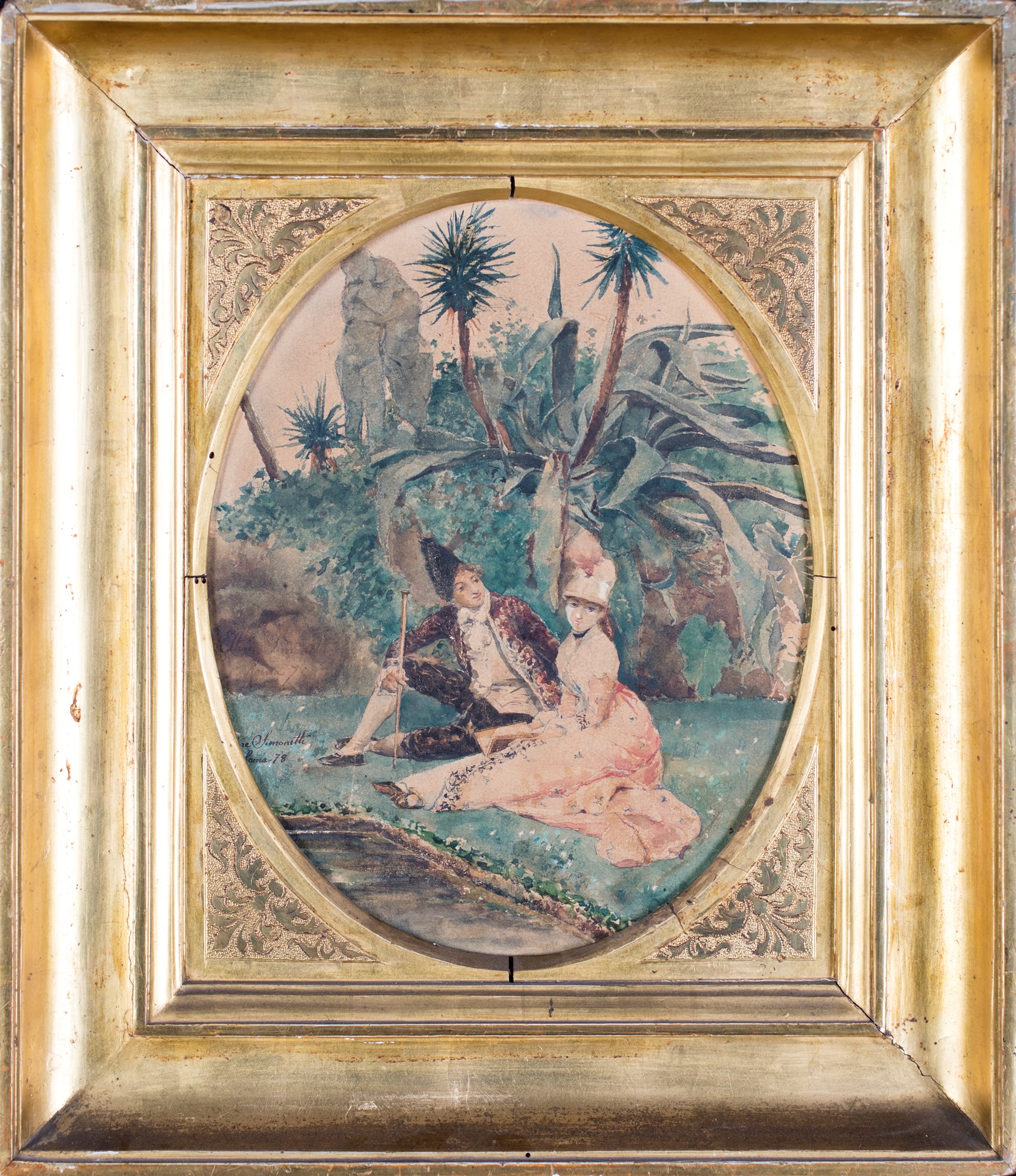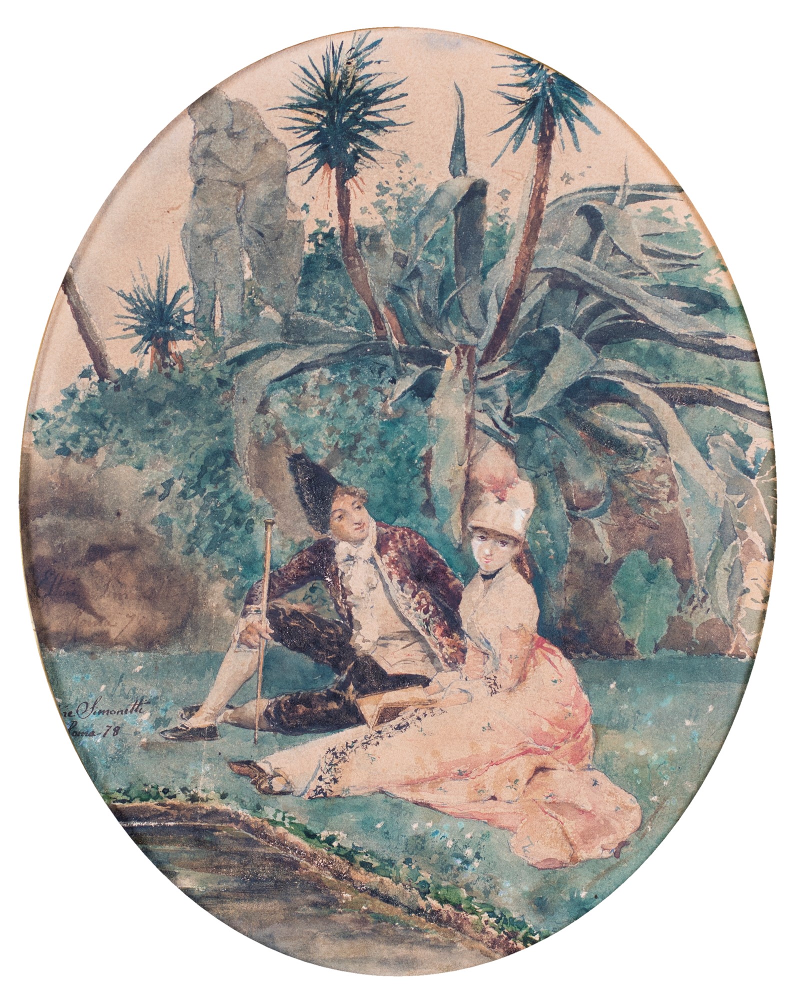 Ettore Simonetti Roma 1857-Roma 1909, Scena galante sotto le agavi F2, acquerello su carta (ovale), 26x20