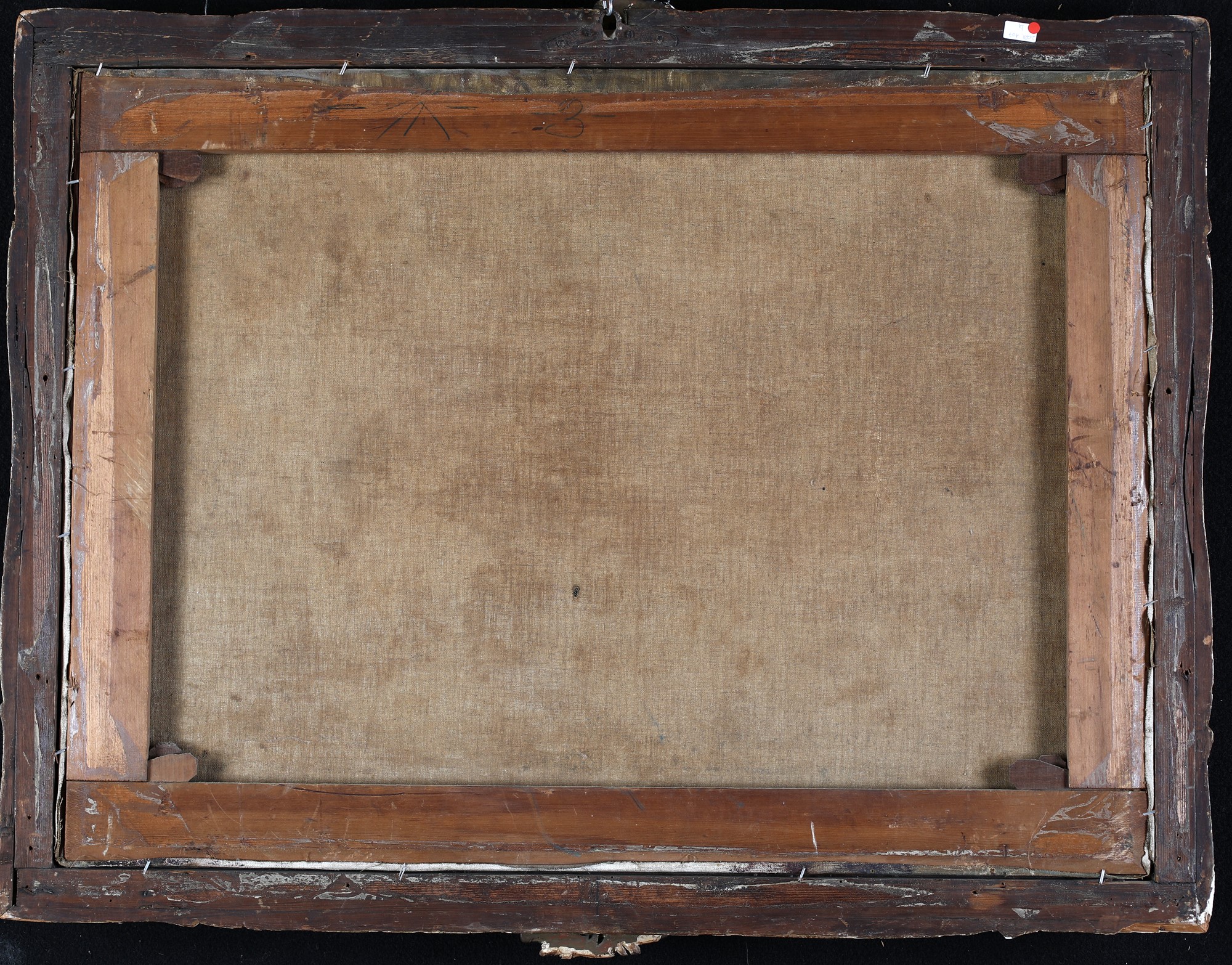 Pittore del XIX secolo , Giardino con rovine architettoniche e figure in abiti settecenteschi F2, olio su tela, 67x93