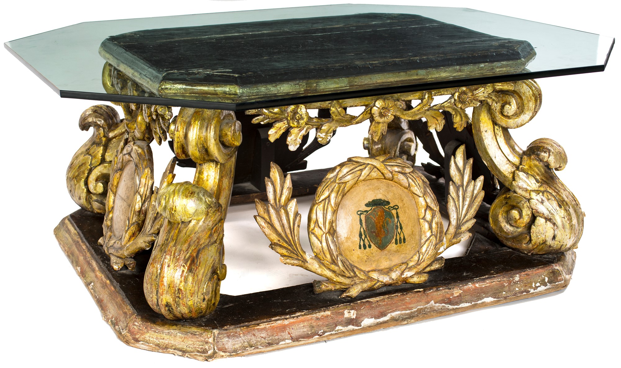 Tavolo basso in legno scolpito e dorato a mecca F2, , 54x130x112