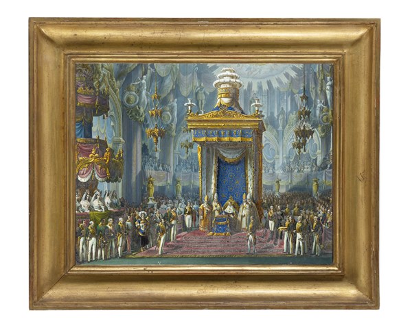 "Incisione acquarellata coeva raffigurante "Intronizzazione di Ferdinando I a Re del Regno Lombardo-Veneto" (cm 30.5x39) Coloritura a mano dell'epoca ad acquerello, tempera e biacca di Giuseppe Mazzola (Valduggia 1748-Milano 1838) Firmato in basso a destra"