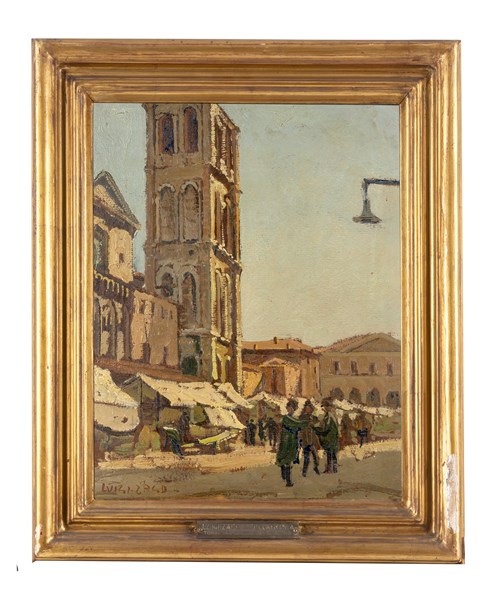 Luigi Zago "Torre del Duomo di Ferrara" olio su cartone (cm 42x33,5) Firmato e